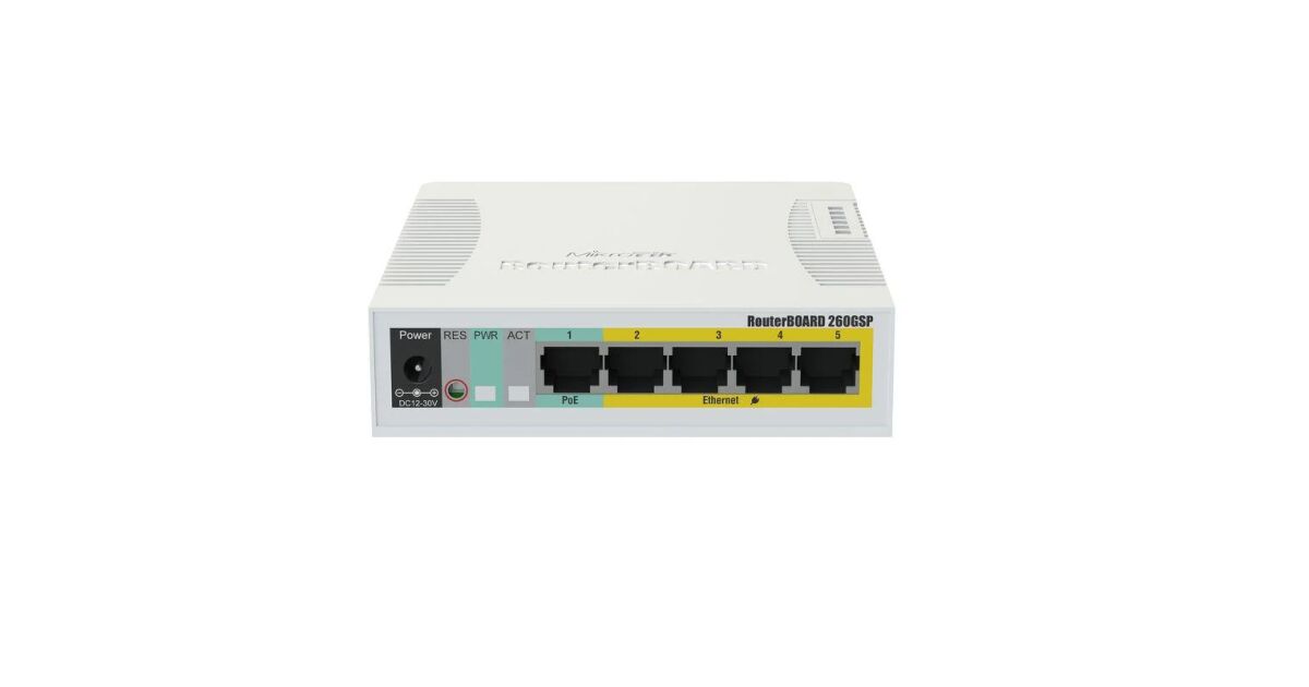 Dieser MikroTik RB260GSP Gigabit Ethernet Switch ist die perfekte Wahl für Heim- oder kleine Unternehmensnetzwerke. Mit fünf Gigabit Ethernet LAN-Ports, einem SFP-Port und einem PoE-Port bietet er eine flexible und effiziente Netzwerklösung.