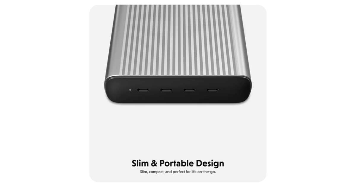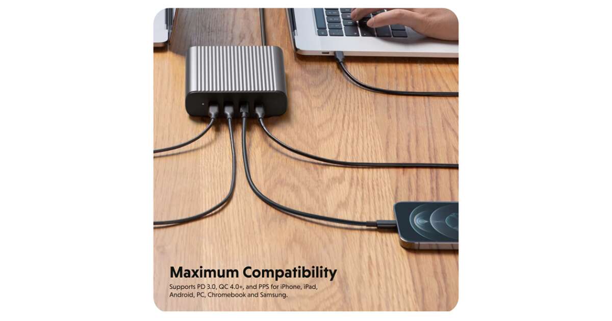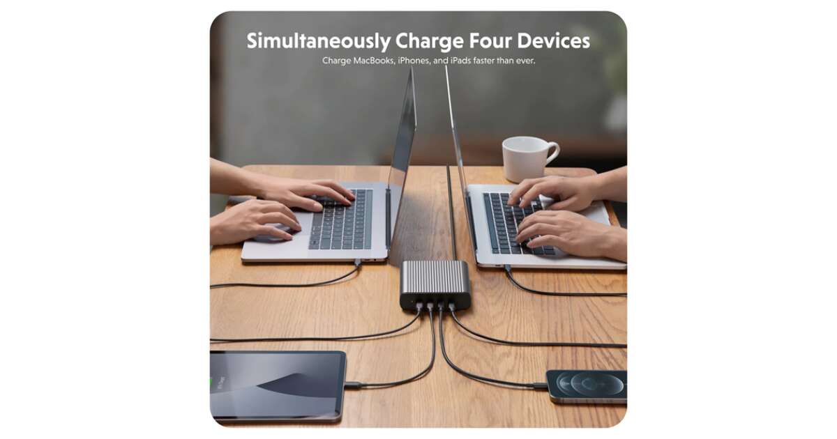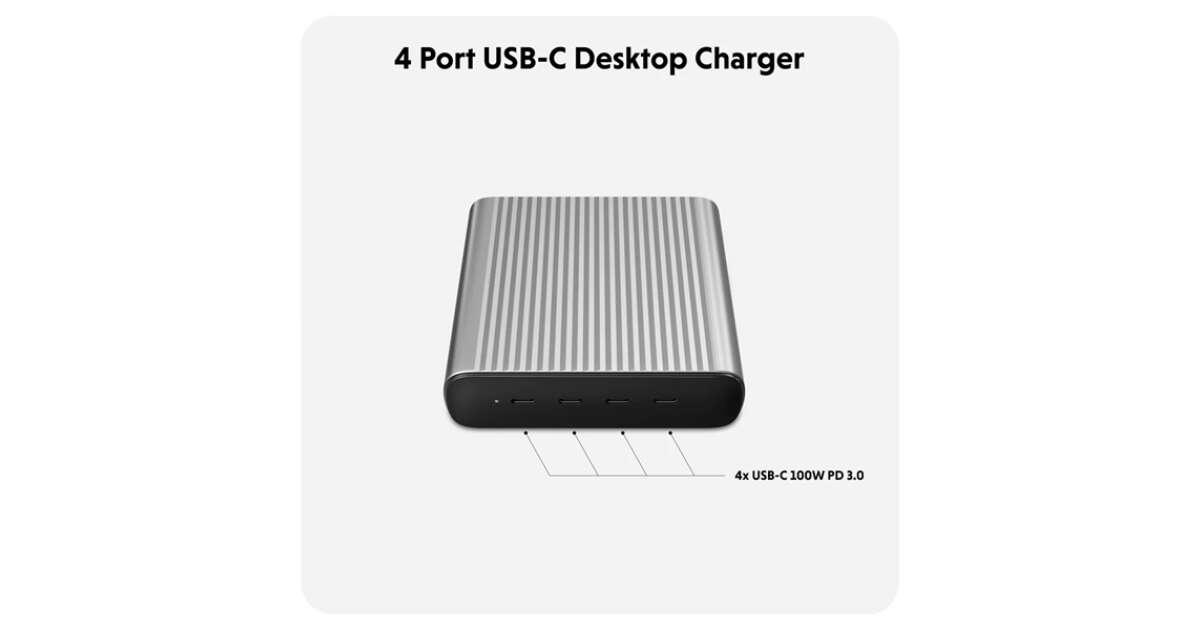 - Vier 100W USB-C Power Delivery Anschlüsse: Lade bis zu vier Laptops, Tablets oder Smartphones gleichzeitig auf.