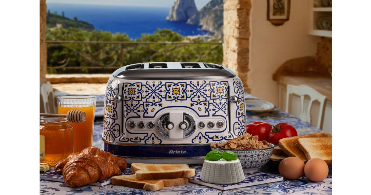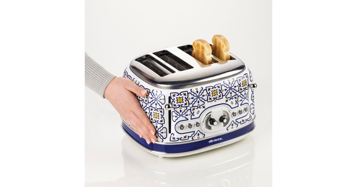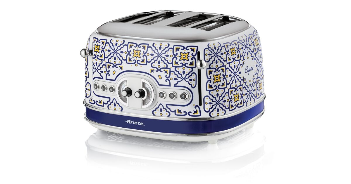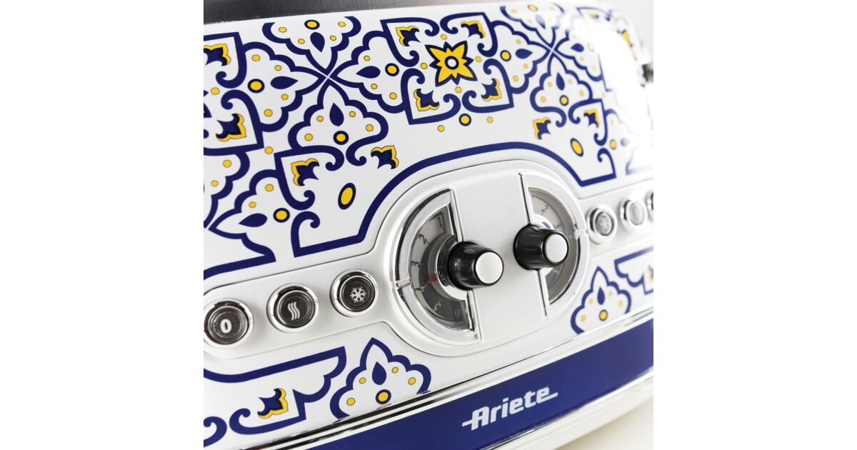-Toaster Ariete Capri 0156/0C, 1600 W, 4 Scheiben, 3 Funktionen, 6 Stufen, herausnehmbares Krümelfach, weiß/blau Beschreibung
