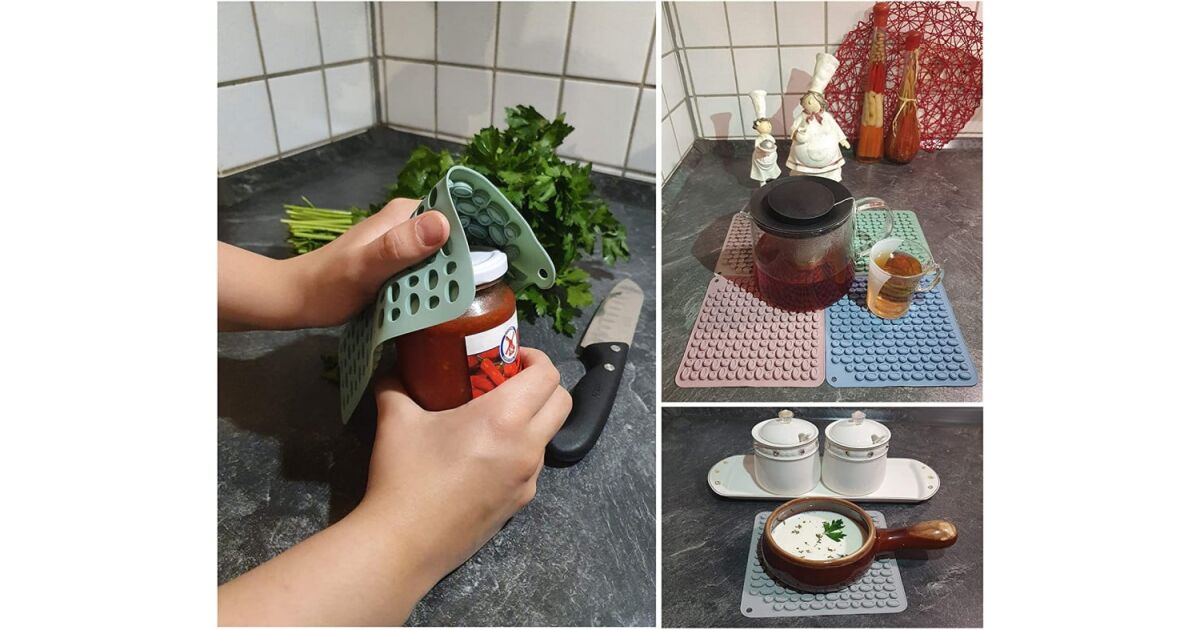 Diese Silikonuntersetzer sind nicht nur ein Schutz für Oberflächen, sondern echte Küchenhelfer! Sie schützen die Hände vor der extremen Hitze heißer Töpfe, eignen sich aber auch perfekt zum Öffnen von Gläsern, als Topfuntersetzer, zum Schutz des Tisches oder sogar zum Schälen von Knoblauch.