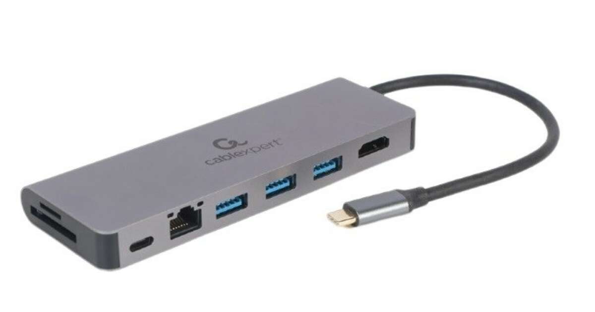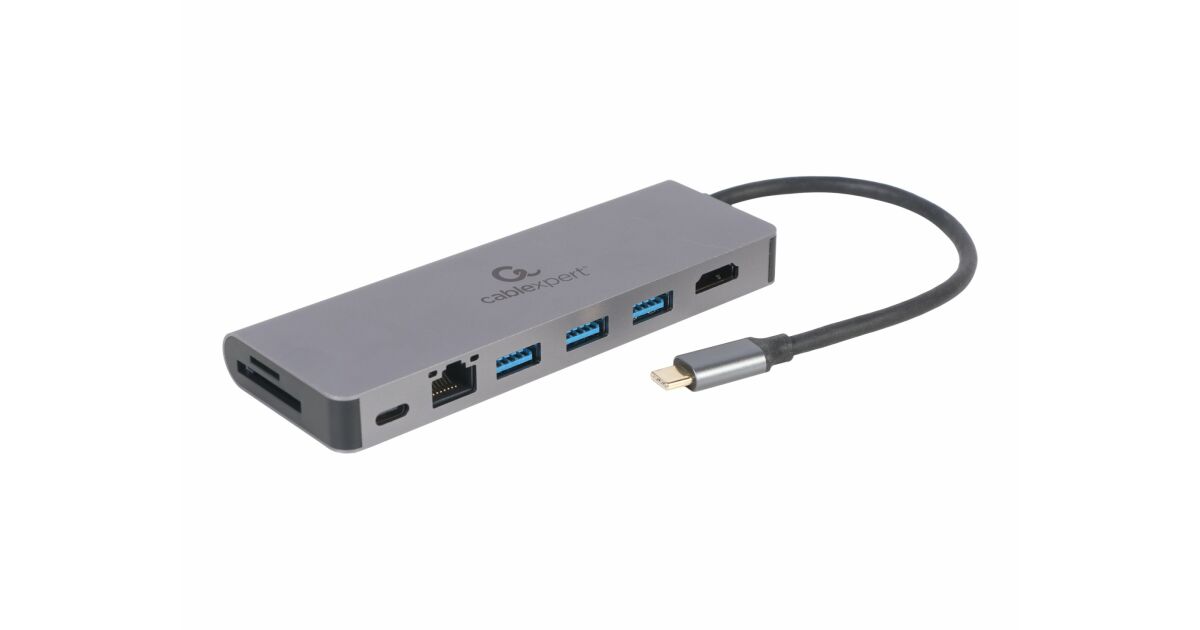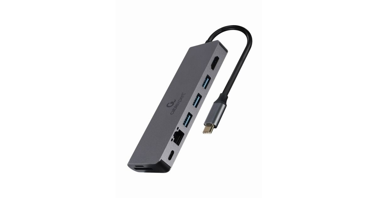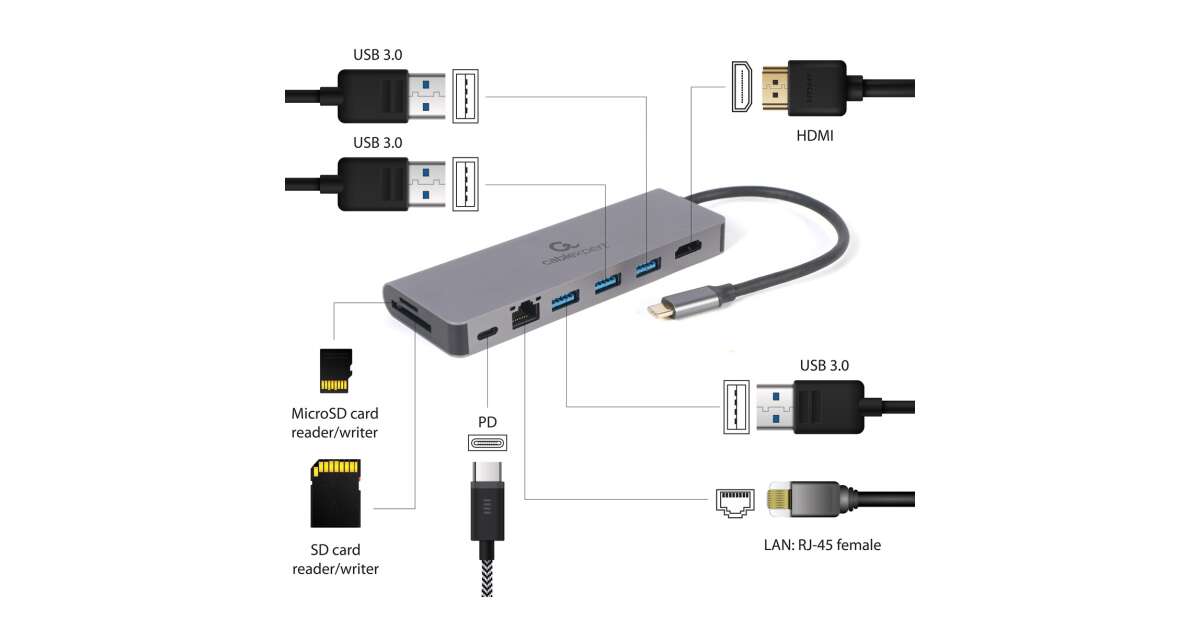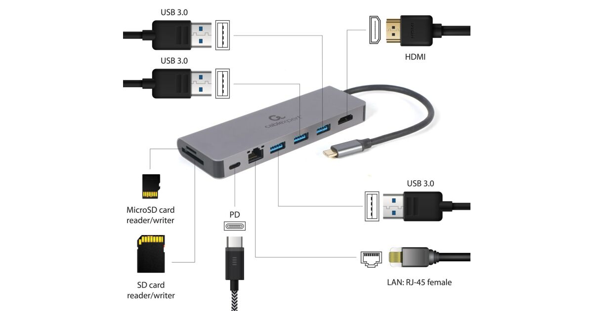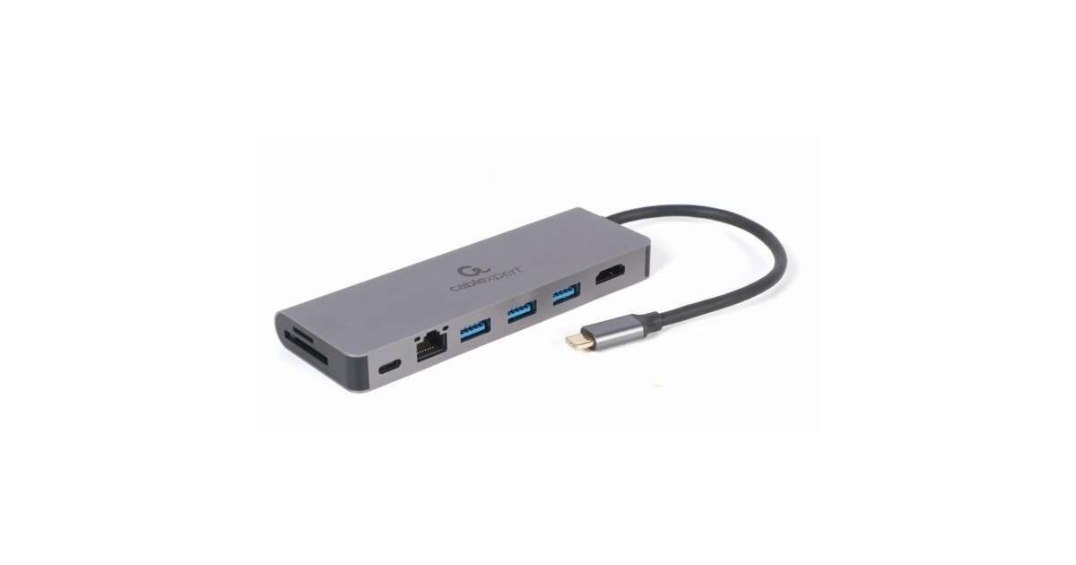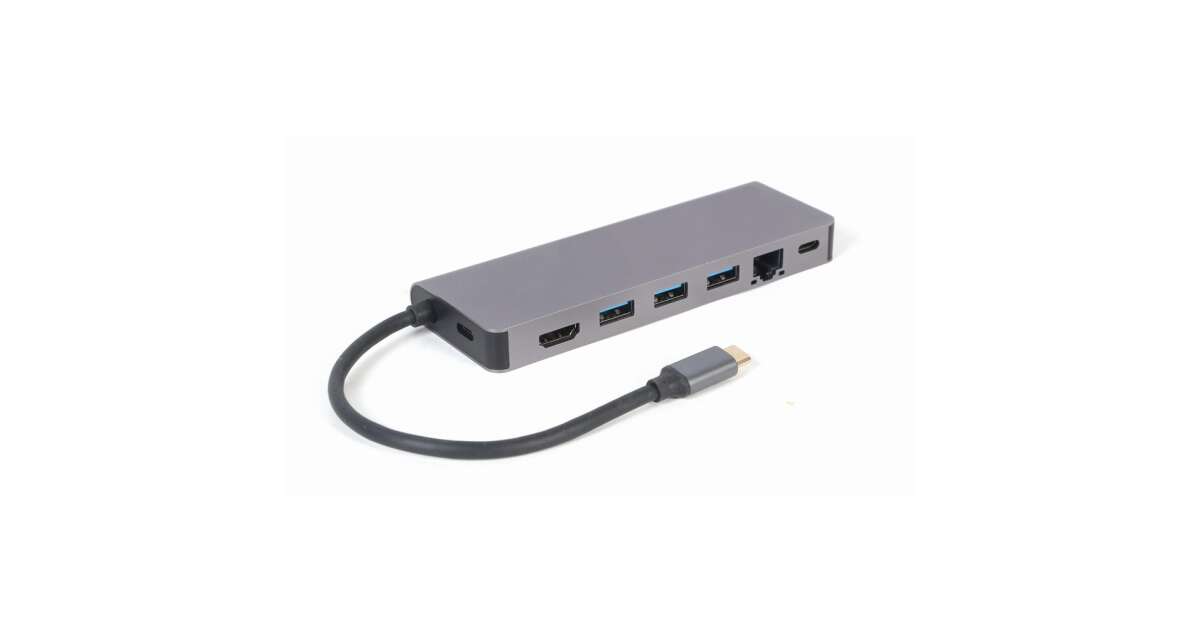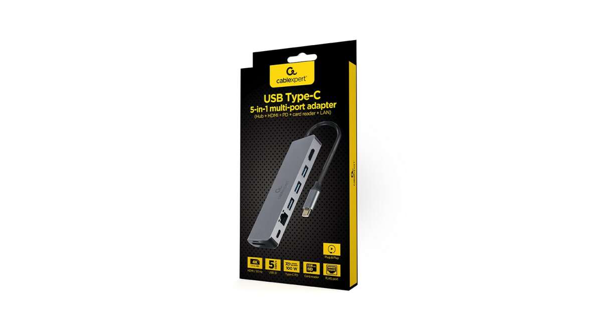 GEMBIRD A-CM-COMBO5-05 USB-Hubadapter mit mehreren Anschlüssen, Typ C, 5-in-1-Hubadapter, HDMI, PD, Kartenleser, LAN Beschreibung