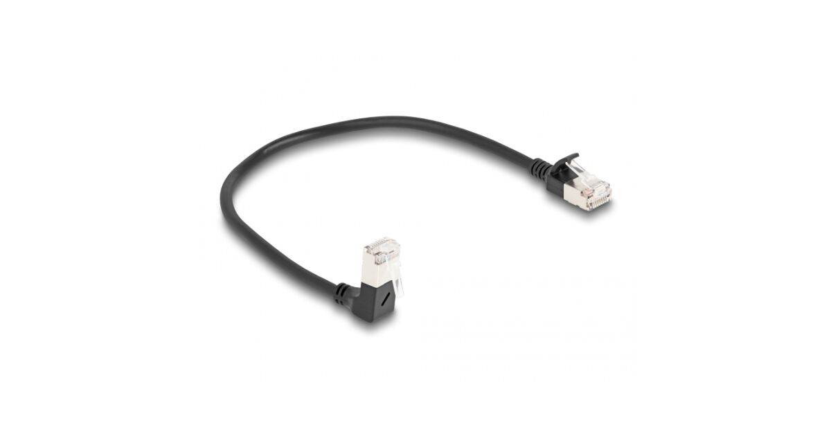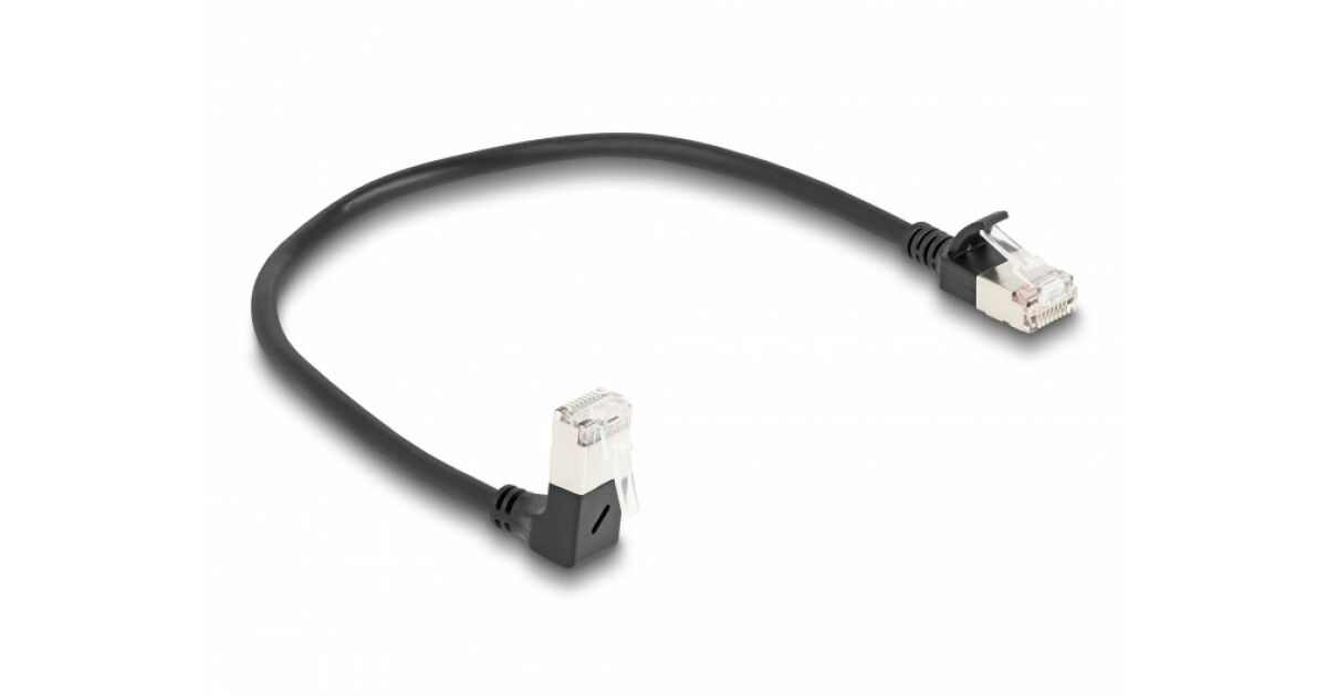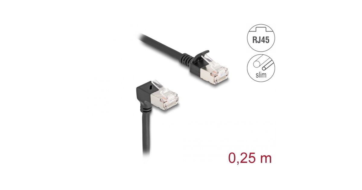Delock RJ45 Netzwerkkabel Cat.6A S/FTP dünn 90 Grad abwärts gebogen / gerade 0,25 m schwarz Beschreibung