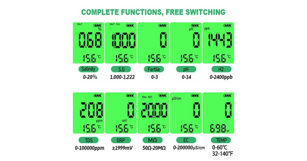 10-in-1-Wasserqualitätstester (PH/TDS/EC/ORP/S.G/Salzgehalt/Temperatur/H2/Fruchtbarkeit/Widerstand) für Schwimmbäder, Trinkwasser, Kochen, Aquarien und mehr Meinungen