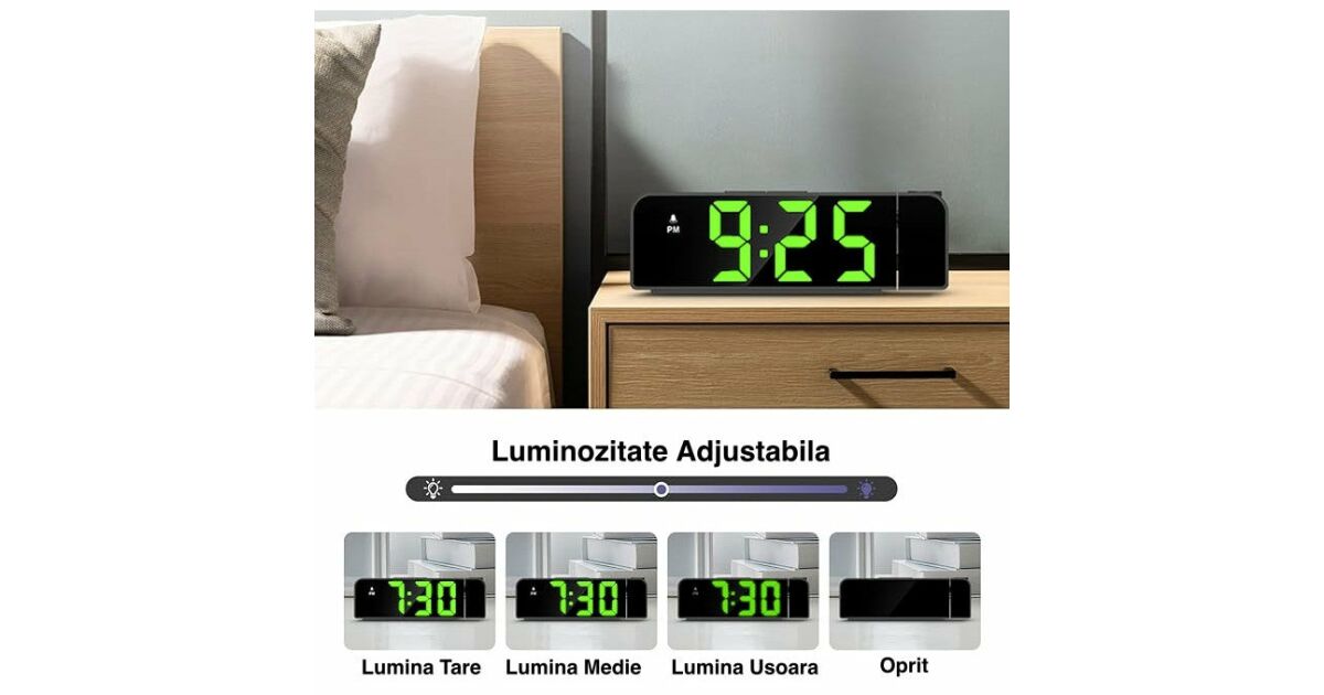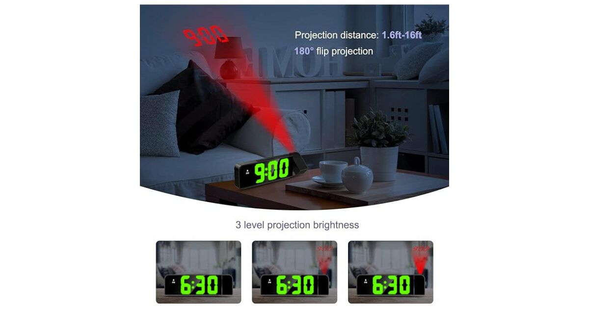 - Klare Projektion: Projiziert die Uhrzeit bis zu 5 Meter weit, mit einstellbarer Helligkeit.