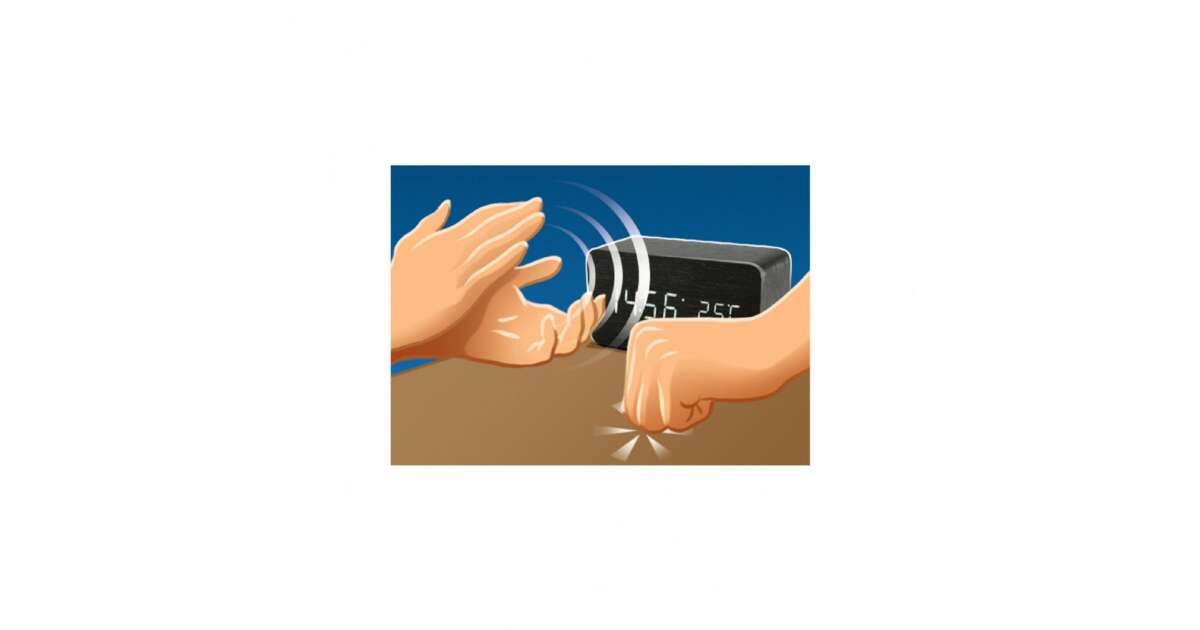 Digitaler LED-Wecker Home OC 04, Echtholzbezug, durch Klatschen aktivierbares weißes Display, Datums- und Temperaturanzeige, Batterie- oder Netzstromversorgung Beschreibung