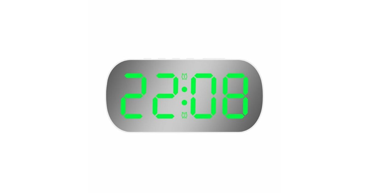 Grüne LED-Digitaluhr, Ovaler Spiegelstil, Wecker, LED-Display, 5 Helligkeitsstufen, Adapter enthalten, Weiß Meinungen