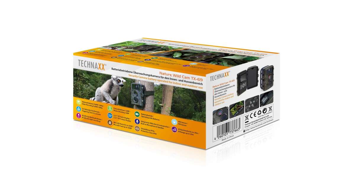 Wildcam Technaxx TX-69 Überwachungskamera, FullHD 1080p, TFT-LCD-Bildschirm 2,4", PIR-Sensor, IR, IP56, microSD, Mikrofon, Lautsprecher, 8xAA/6V 1,5A, Tarnung Beschreibung