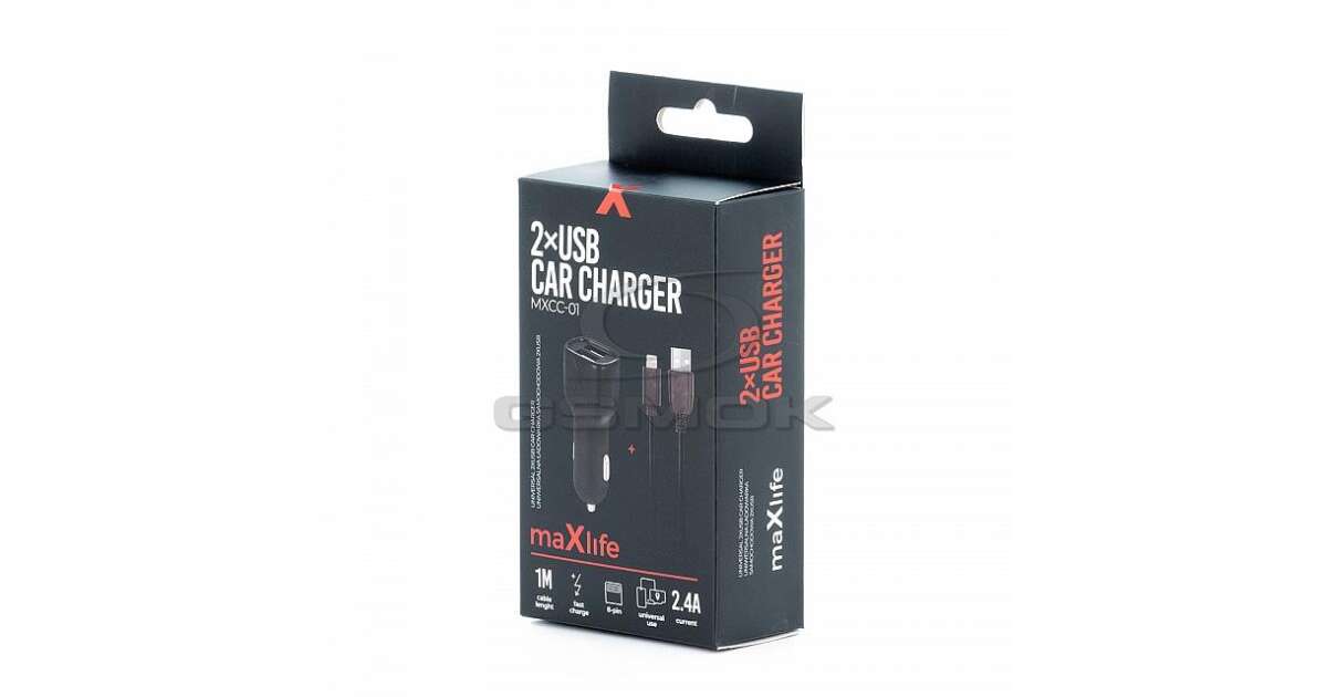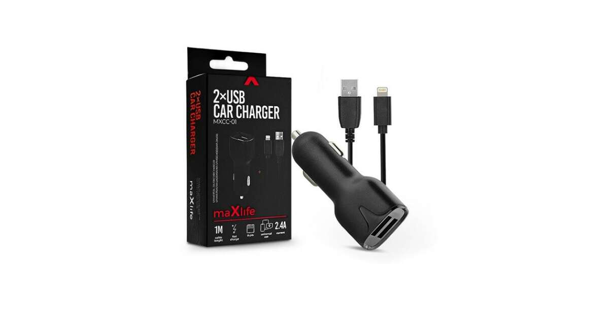 Maxlife 2xUSB szivargyújtó töltő adapter 1 m-es lightning vezetékkel - Maxlife MXCC-01 Lightning 2xUSB Car Fast Charger - 5V/2,4A - fekete