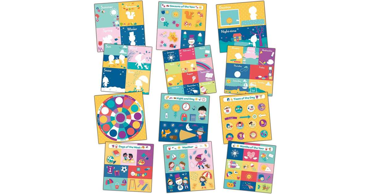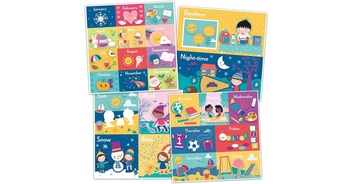 This fun sticker calendar is a great way to help your child learn about basic time concepts. With 6 colorful boards and 100 reusable stickers, little ones can learn about months, days of the week, seasons, weather, day and night in an interactive way. ✨