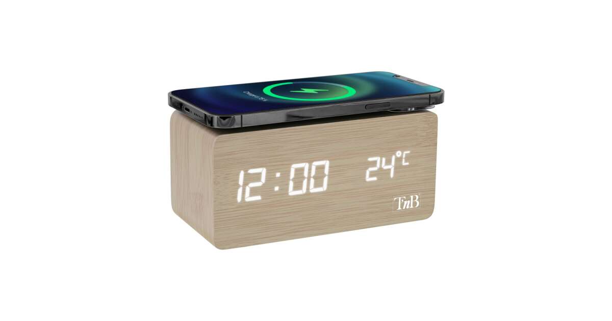 TNB JOY wood-covered alarm clock with LED display and wireless charger