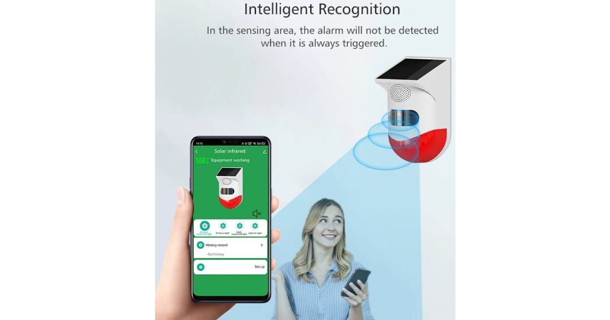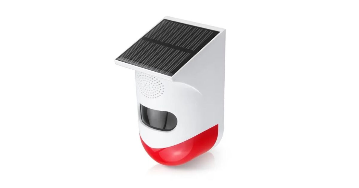 Solar PIR Motion Sensor Alarm, Solar or USB Charging, IP65, with Remote Control, App Control, White-Red