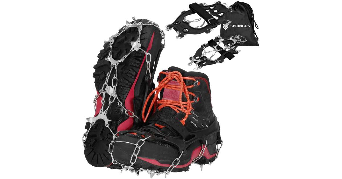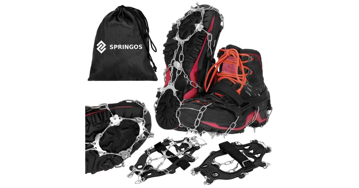 Walk safely on icy and snowy roads with these Springos snow chains! Made from high-quality TPE material and steel spikes for maximum grip on slippery surfaces. Easy to put on and take off, making them convenient to use.