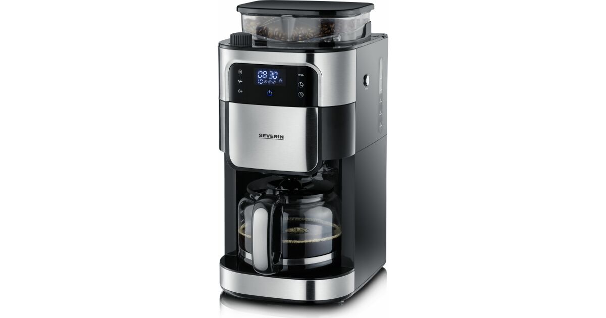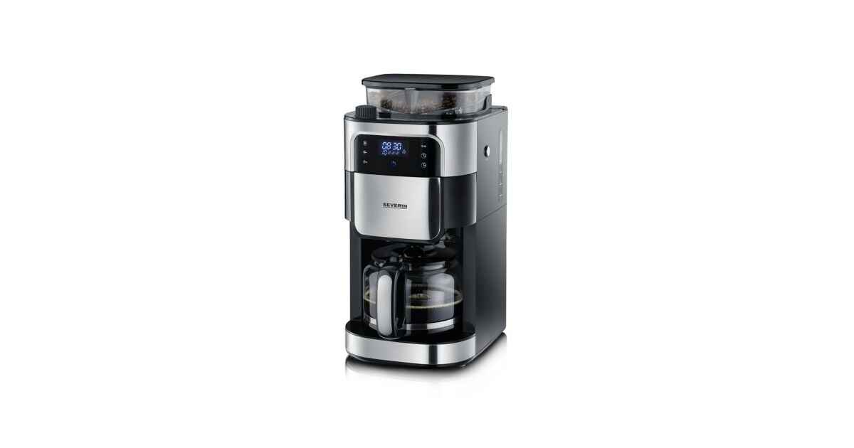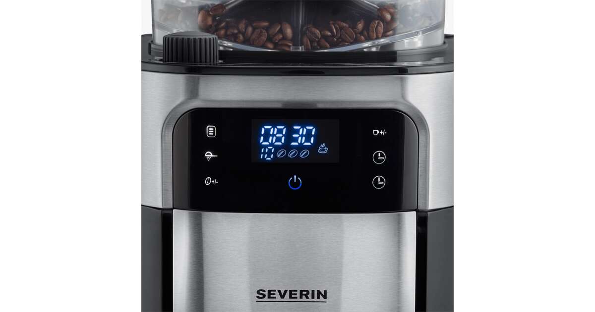 Severin Coffee Maker with Grinder, 1.25 Liter Capacity, Compatible with Beans/Ground Coffee, 200g Ground Coffee Capacity, Adjustable Grind, 3-Level Aroma Setting, Graduated Glass Carafe, Timer, Touchscreen description of