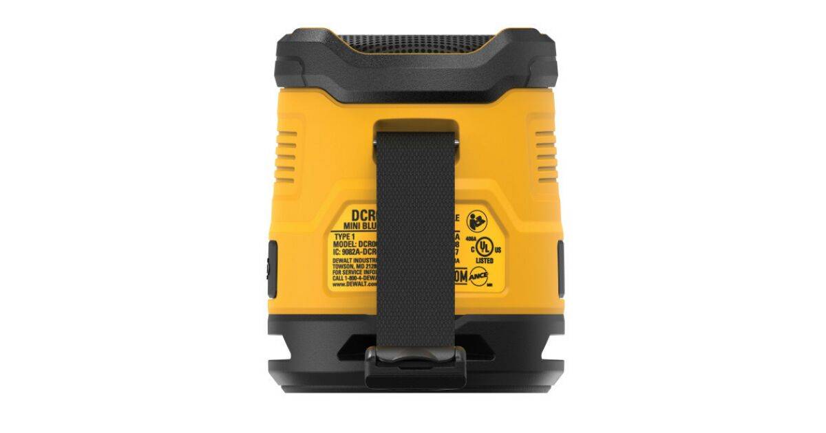 The passive speaker delivers class-leading audio performance and a maximum volume of 86 dbThe integrated Li-ion battery provides up to 16 hours of battery life at 50% volume and fully charges in 2 hoursBluetooth 5.0 pairing and connectivity allows users to quickly and reliably pair up to 30 meters (98 feet) awayExperience up to 16 hours of battery life with the DEWALT DCR008 rechargeable mini Bluetooth speaker. This rugged speaker is tough for the workplace thanks to its rugged housing and IP67 rating for dust and water protection. The carrying strap and buckle allow for convenient transport and storageRugged designWith an IP67 rating for the highest level of protection against dust and liquids, the unit is rugged enough to withstand the elements in the workplaceThe USB-C charging port takes advantage of the latest USB connection mode, and ensures universal use with any USB-C small device chargerFront control buttons allow the user to control the sound directly from the unit with built-in volume down/up, BT pairing, power on, play/pause buttons.A buckled lanyard ensures that the unit is easy to carry and can be hung on a backpack, belt or any workplace structure