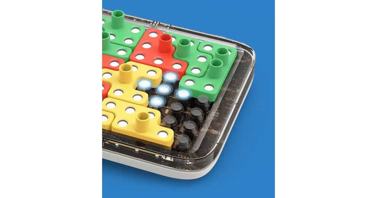 The goal of the game is to fit the colored blocks onto the illuminated points based on the patterns shown on the display. The indicator on the left helps you choose the right colors. 💡