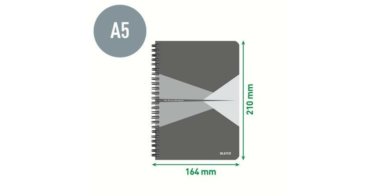 This Leitz Office A5 spiral notebook is ideal for everyday office use. Thanks to its durable PP cover, it provides an excellent writing surface, and the metal spiral binding allows for 360° lay-flat use.