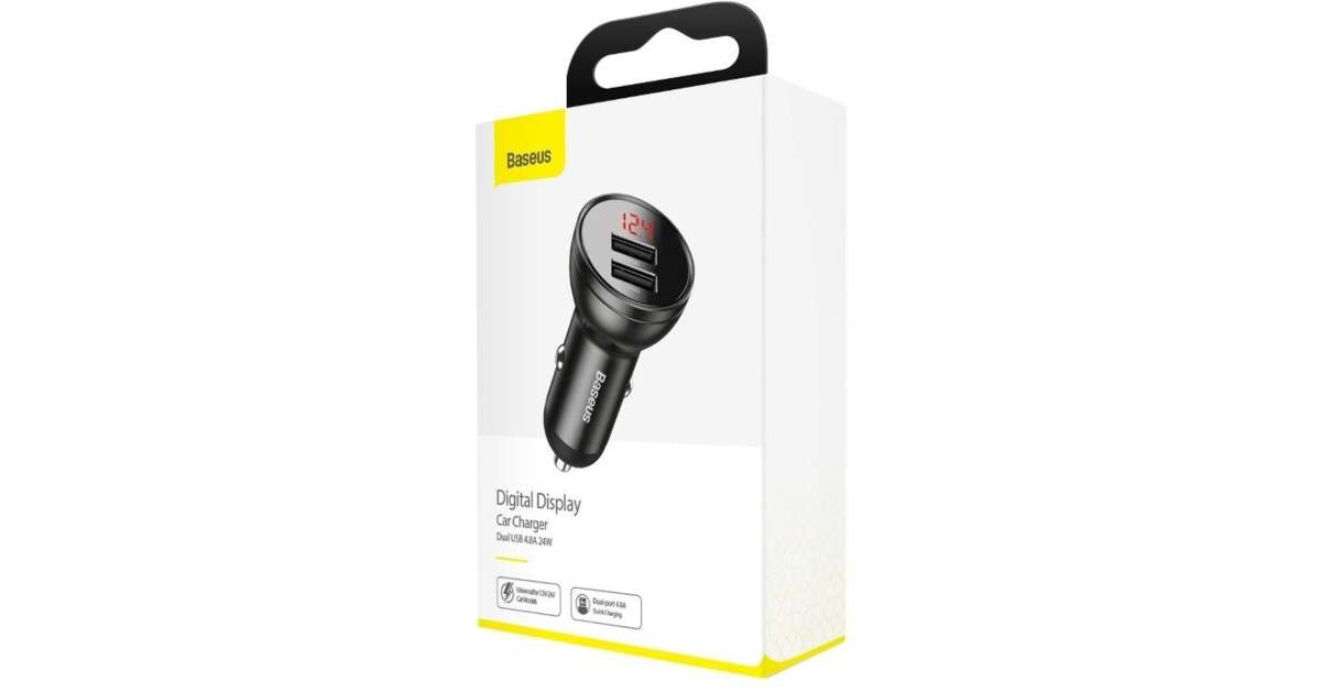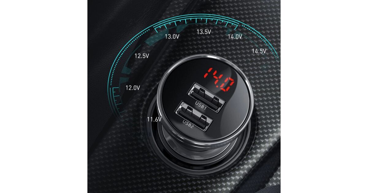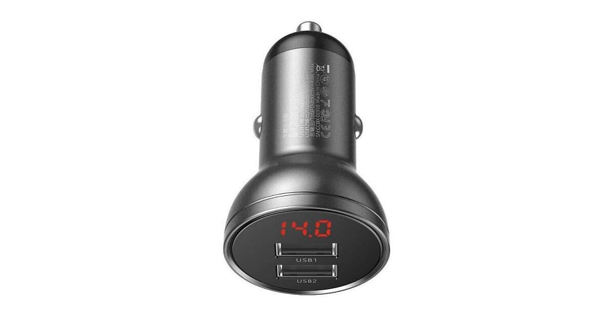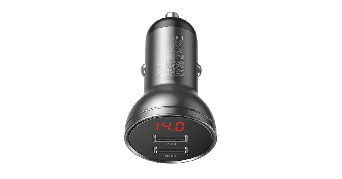 This compact Baseus car charger has two USB ports with a total power output of 24W/4.8A, making it perfect for charging smartphones, tablets, and other mobile devices. The LCD display continuously shows the charging voltage, so you always have a handle on the charging process. The display alternates every 5 seconds between the charging voltage, the input voltage (car battery), and the voltage of the device being charged.