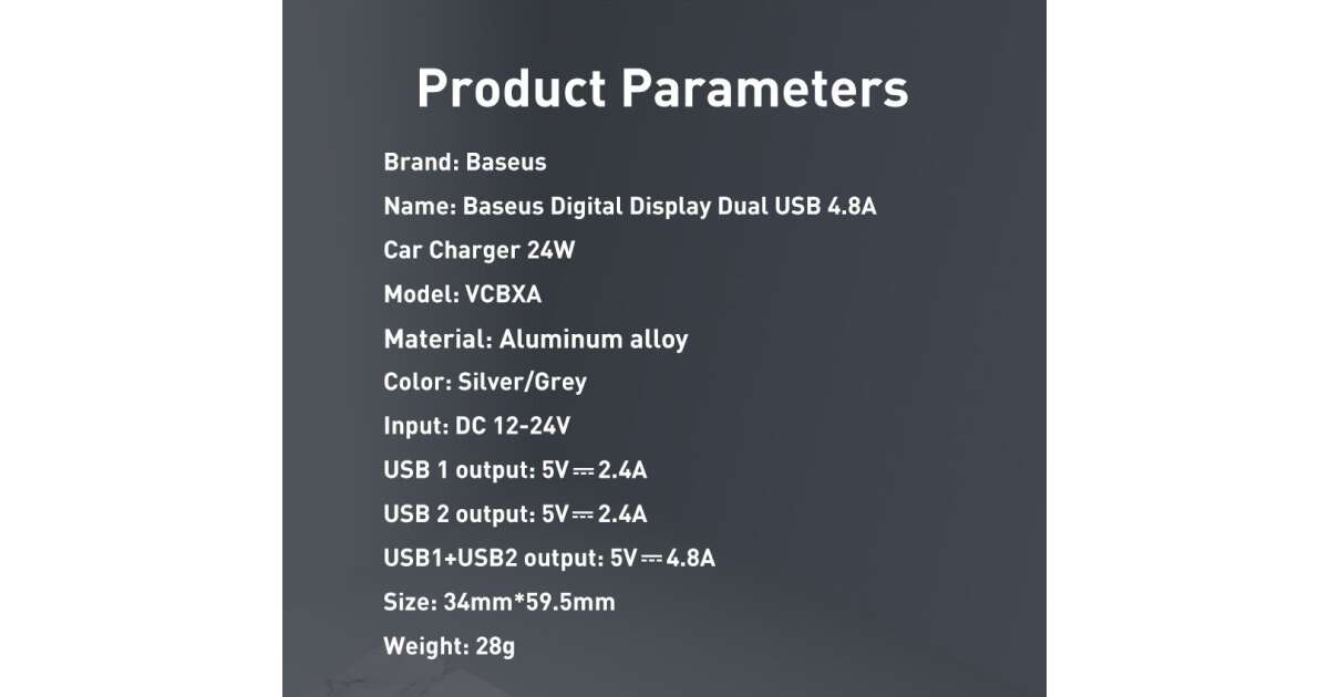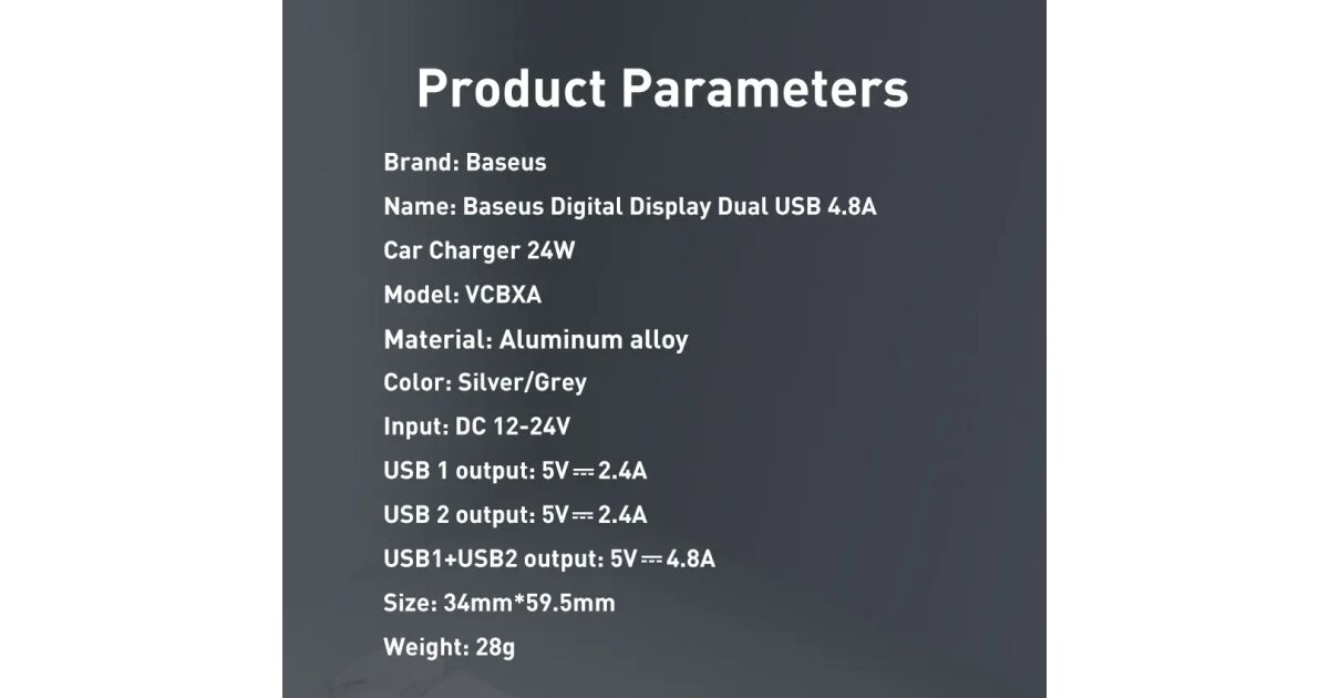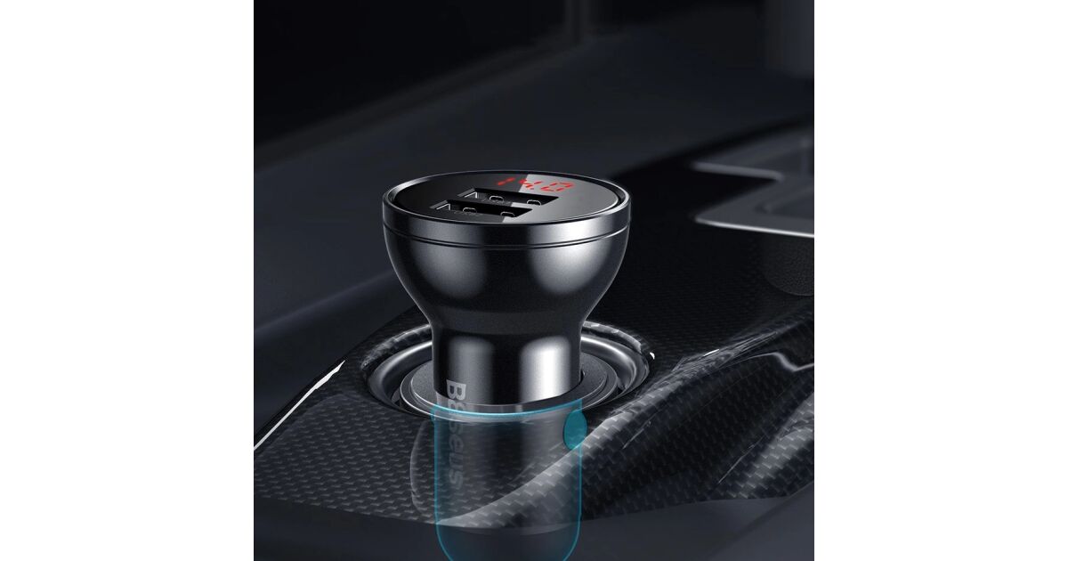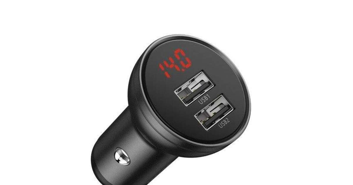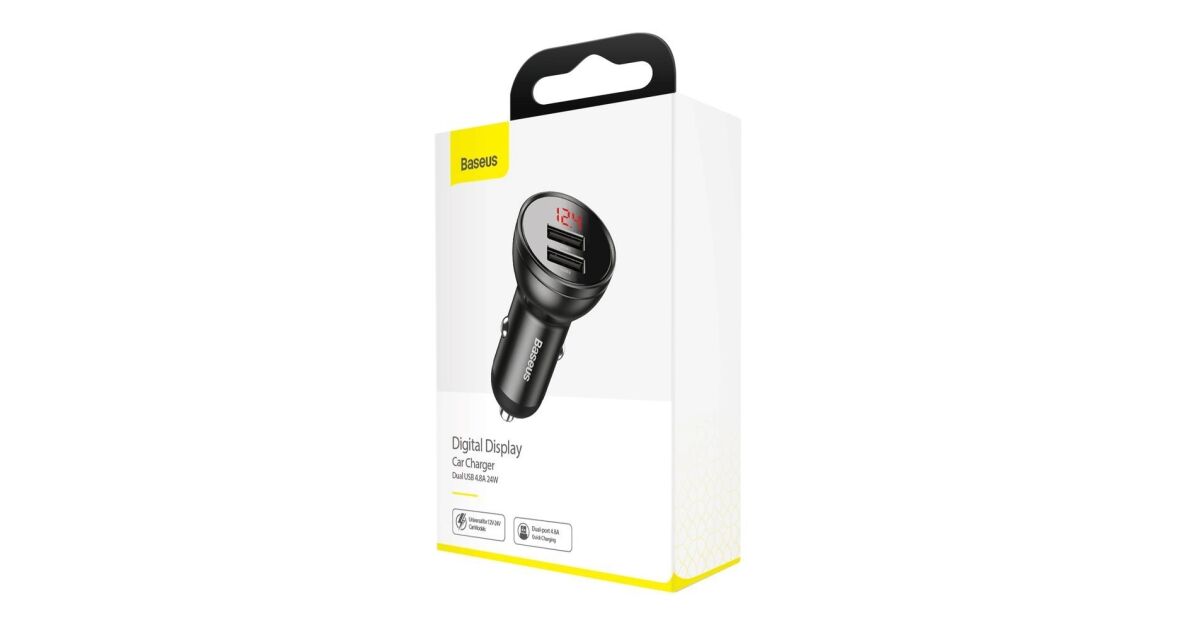 This compact Baseus car charger has two USB ports with a total power output of 24W/4.8A, making it perfect for charging smartphones, tablets, and other mobile devices. The LCD display continuously shows the charging voltage, so you always have a handle on the charging process. The display alternates every 5 seconds between the charging voltage, the input voltage (car battery), and the voltage of the device being charged.
