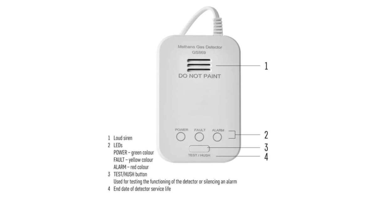The device constantly monitors the air, and if it detects a gas leak, it signals the danger with a loud siren and flashing LEDs. You can test the device's functionality at any time using the TEST/HUSH button.