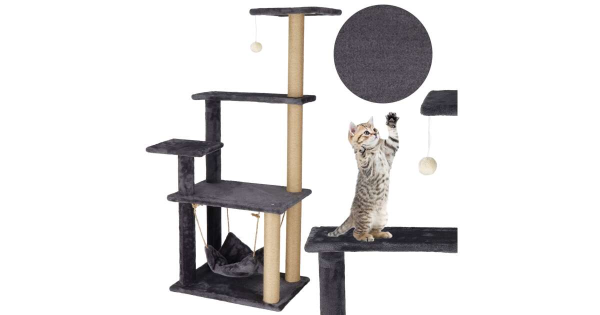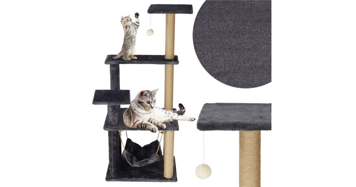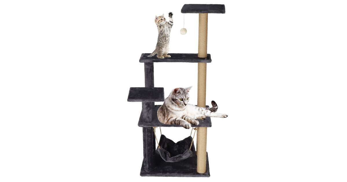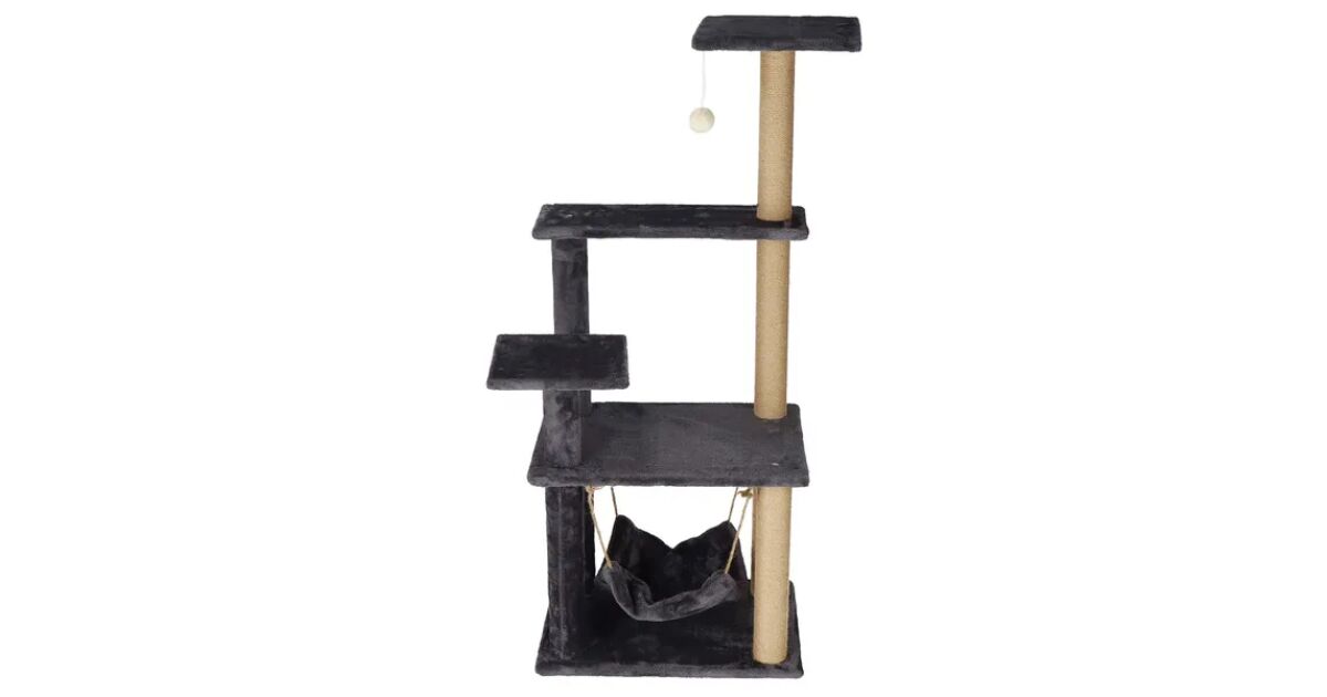 This multi-level cat tree is ideal for your cat if they love to play, climb, and relax. The soft, plush surfaces provide a comfy resting place, while the scratching post keeps those claws in tip-top shape. The hanging bed offers an extra cozy spot for a catnap.