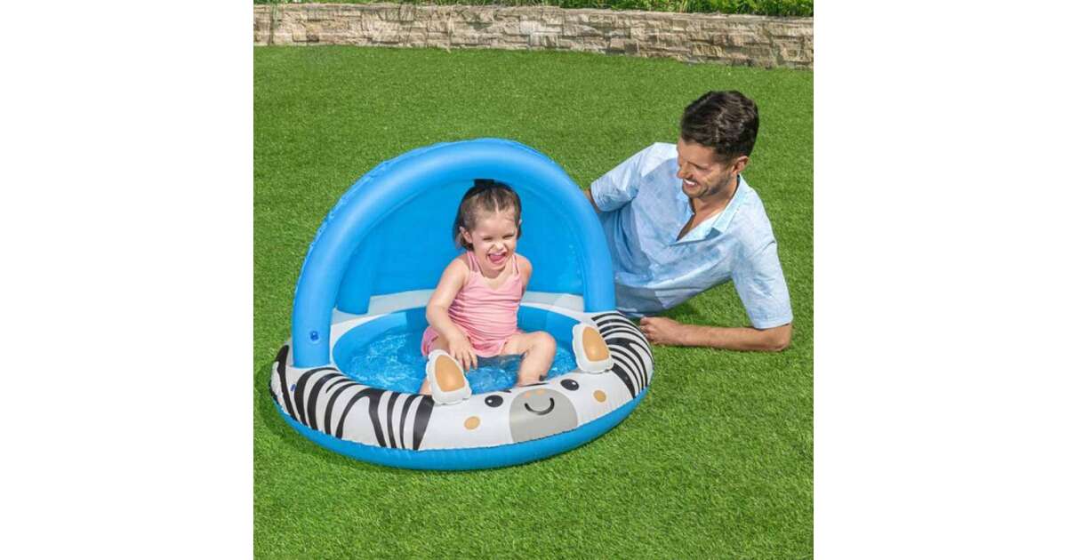 This Bestway inflatable wading pool is ideal for babies on hot summer days. With its cheerful zebra pattern and built-in sunshade, it offers a safe and fun water experience.