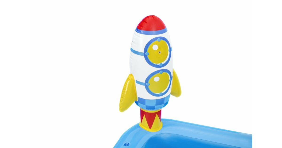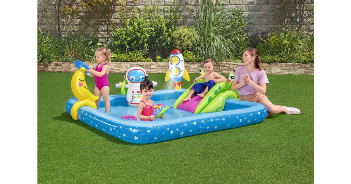 This Bestway inflatable water play center with a slide and fun astronaut figures guarantees summer fun for the little ones! The 239 x 206 x 86 cm pool is big enough for several children to play in at once. Made from soft yet durable PVC material, the pool is safe even for the youngest kids. The built-in sprinkler adds extra fun, and the slide promises exciting adventures. Included are also ring toss toys, an inflatable rocket, moon, and astronaut for even more play options.