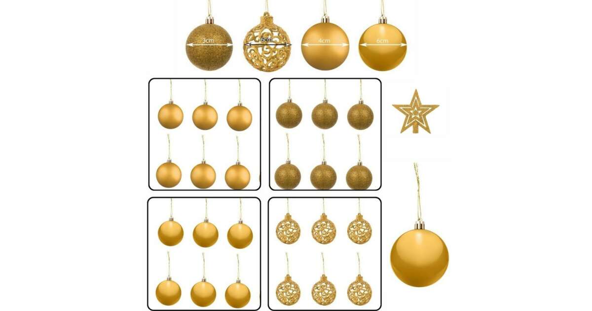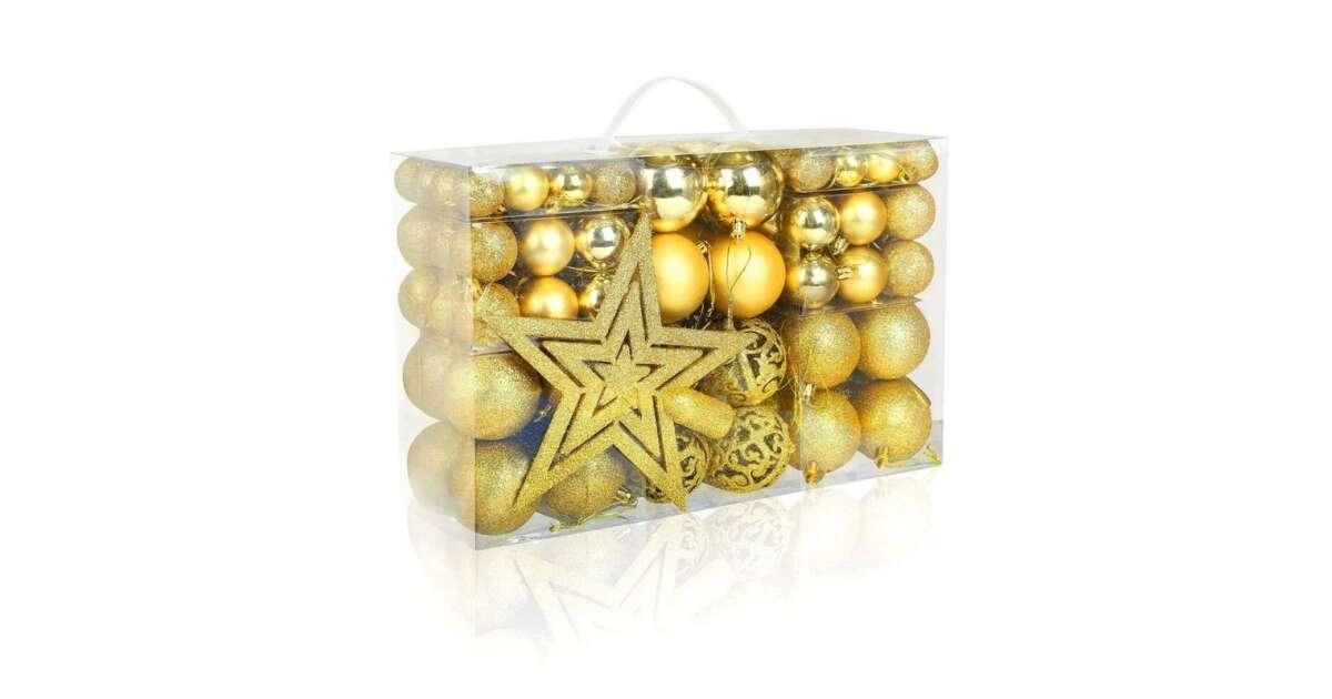 With this 101-piece gold Christmas ornament set, you can create magical lights on your Christmas tree! Different sizes and finishes ensure variety and perfect harmony. The package also includes a beautiful star for the top of the tree.