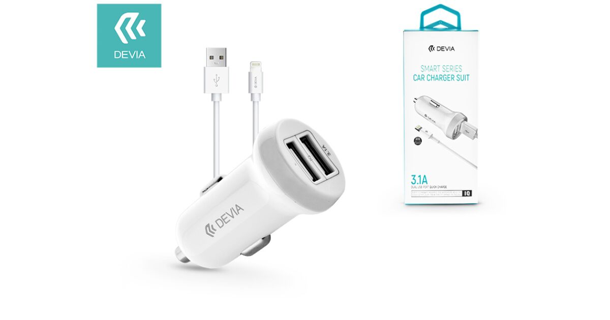 Devia Car Charger Adapter with 2xUSB Inputs + USB-Lightning Cable - 5V/3.1A - Devia Smart Series Dual Car Charger Suit - white