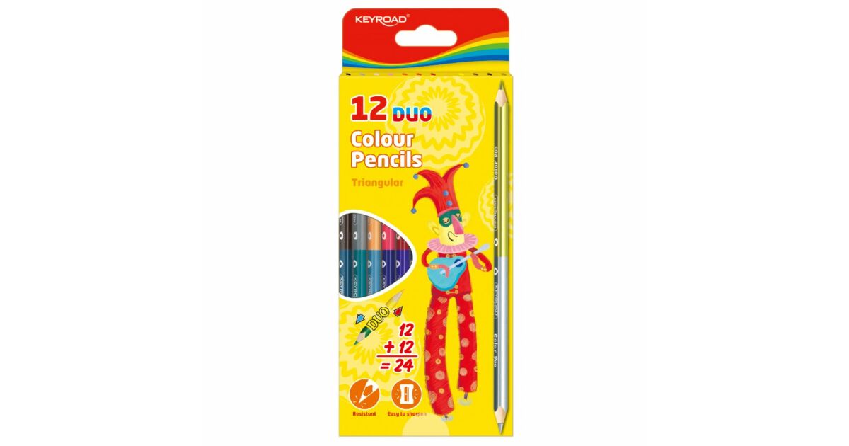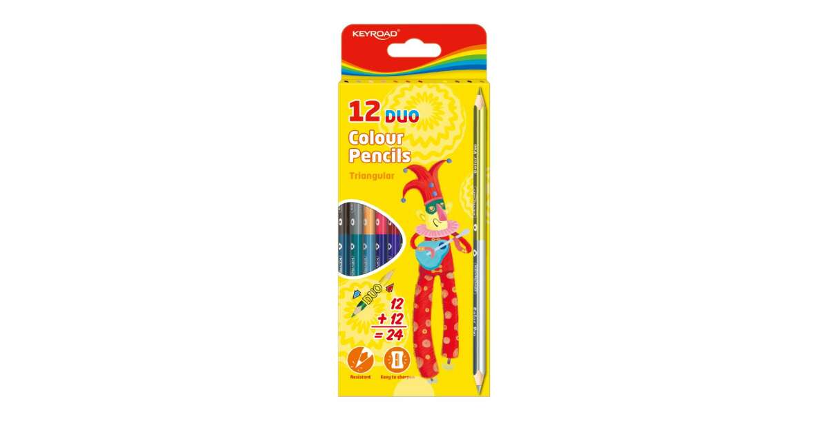 This Keyroad Duo colored pencil set contains 12 double-ended, triangular pencils, giving you a total of 24 vibrant colors! Ideal for drawing, painting, and creative projects.