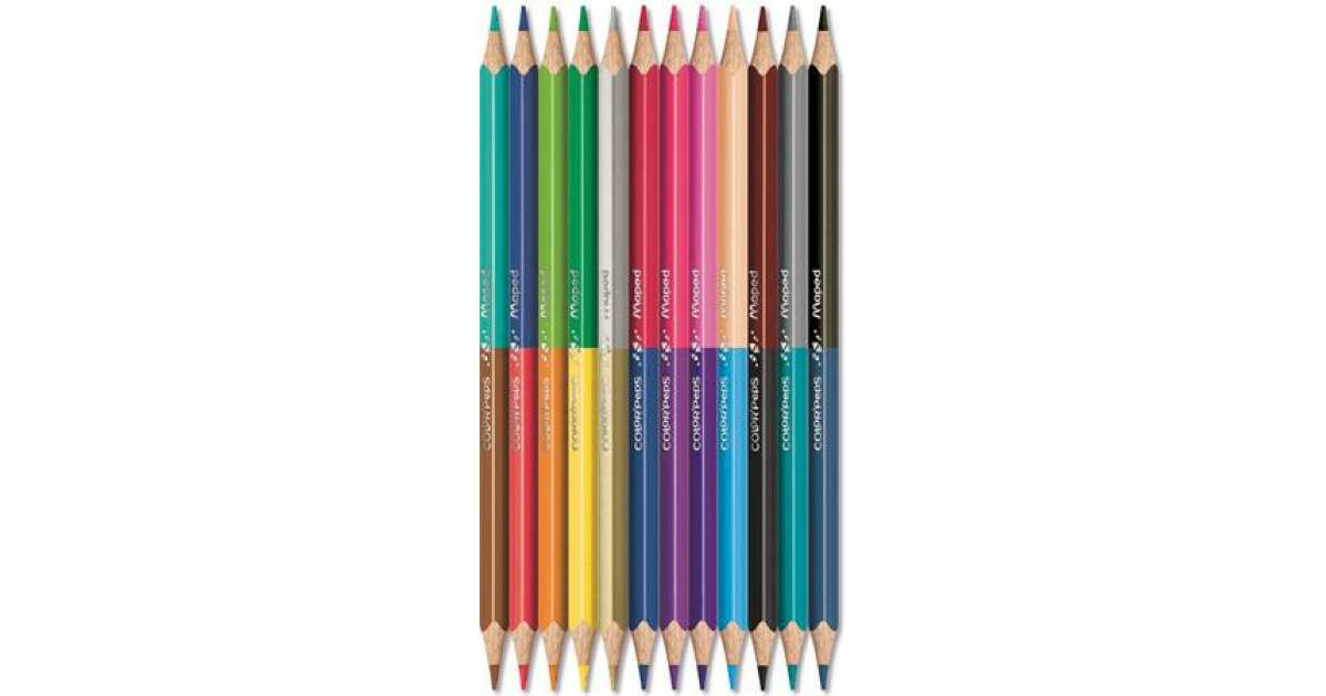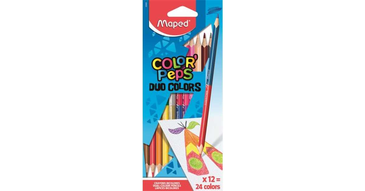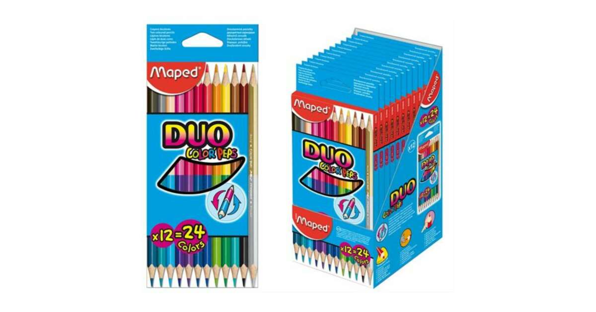 This Maped Color'Peps Duo colored pencil set contains 12 double-ended, triangular pencils, giving you a total of 24 different colors. Perfect for drawing, coloring, and creative projects for kids and adults alike!