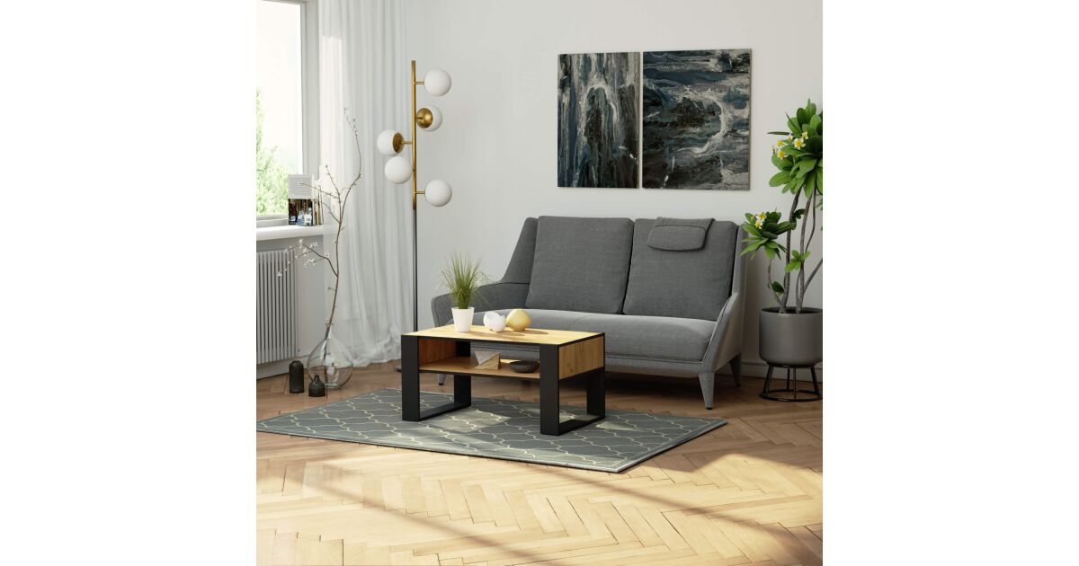 This stylish DOMI coffee table is the perfect addition to your living room. Made of high-quality 16 mm laminated board, it is resistant to scratches and wear. The black metal legs give it a modern look, while the light oak finish exudes warmth.