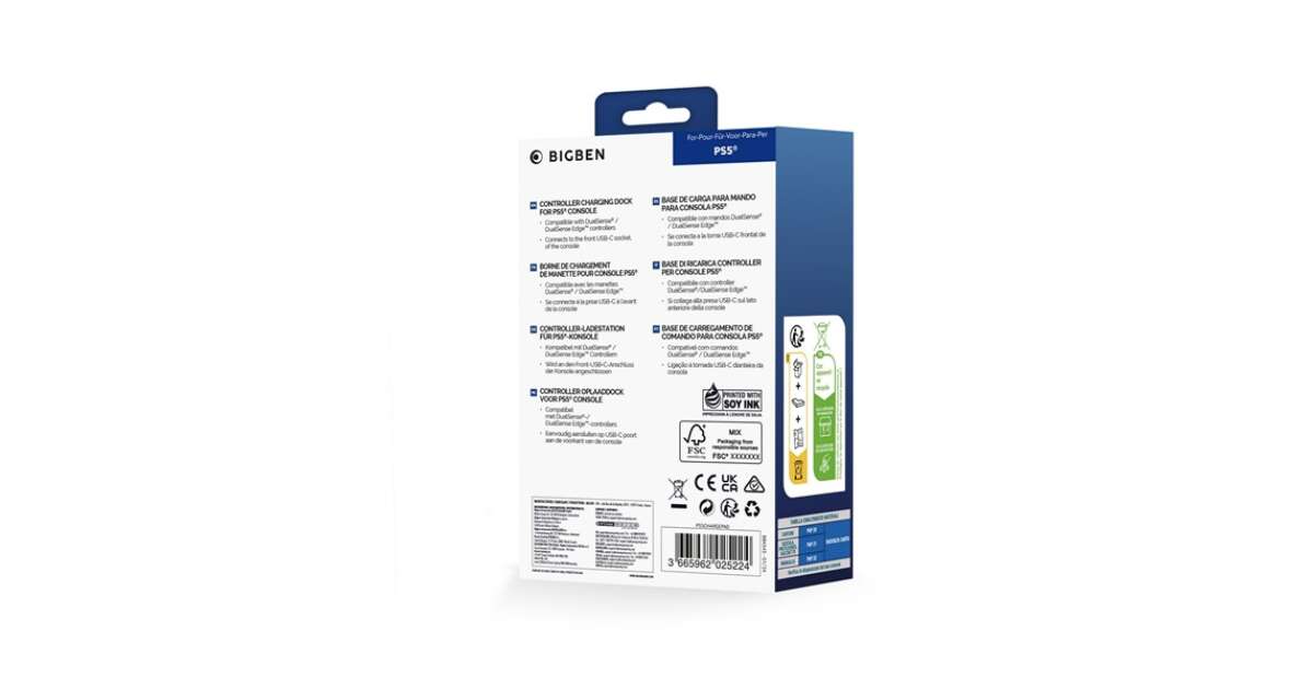 This Bigben PS5 controller charging station is the perfect solution for conveniently and quickly charging your PS5 DualSense controllers. Simply insert the controllers and let the charging station take care of the rest. Charging is done via the USB-C port, so there's no need for a separate adapter.