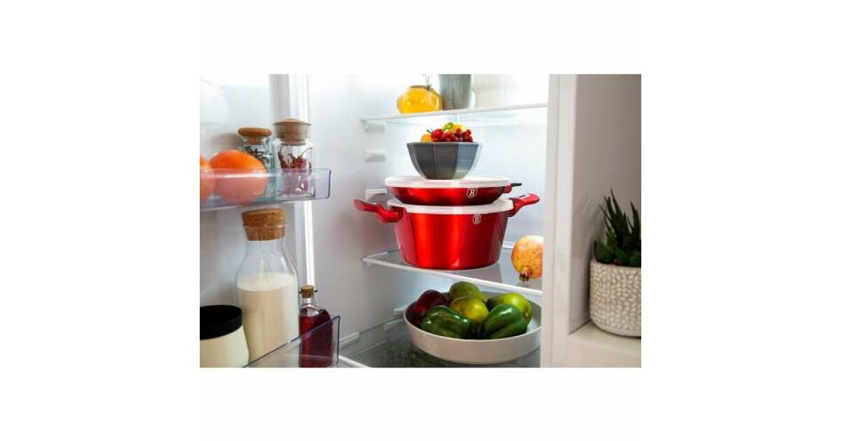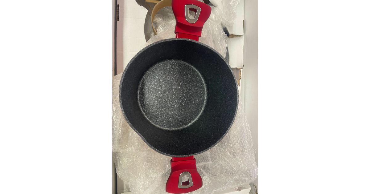 This 22-piece Berlinger Haus cookware set is an ideal choice for your kitchen, even in its reduced condition! The Metallic Burgundy Edition adds an elegant look, and the detachable handle allows for space-saving storage. The set has damages as shown in the picture, but its functionality is excellent.
