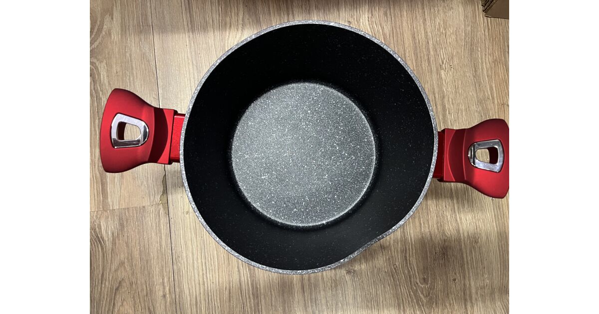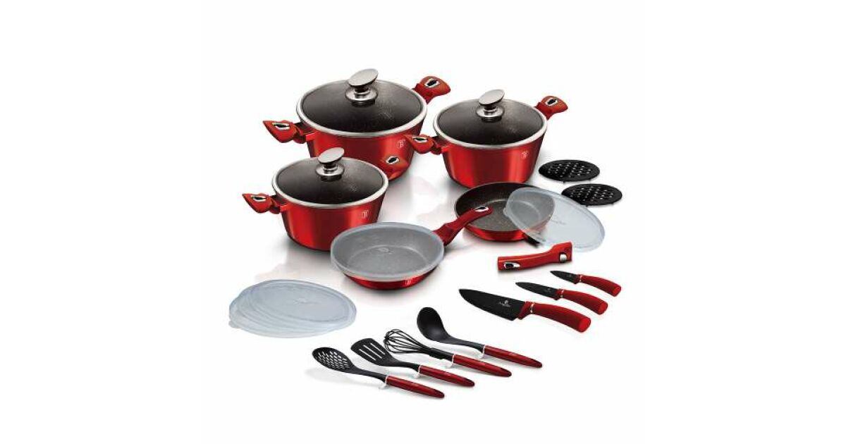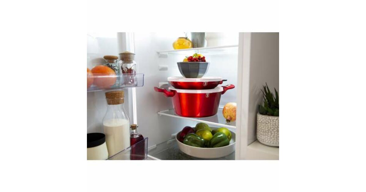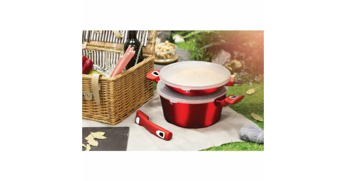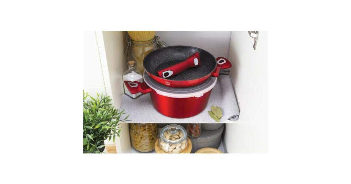 The Berlinger Haus Metallic Burgundy Line forged aluminium cookware with three layers of marble coating and turbo induction base allows you to cook your food more energy-efficiently and quickly. They can be used on both induction and conventional (gas and electric) hobs. Ergonomic, soft-touch handles and grips. Snap-on handles. Minimum fat required for cooking, yet food does not burn.