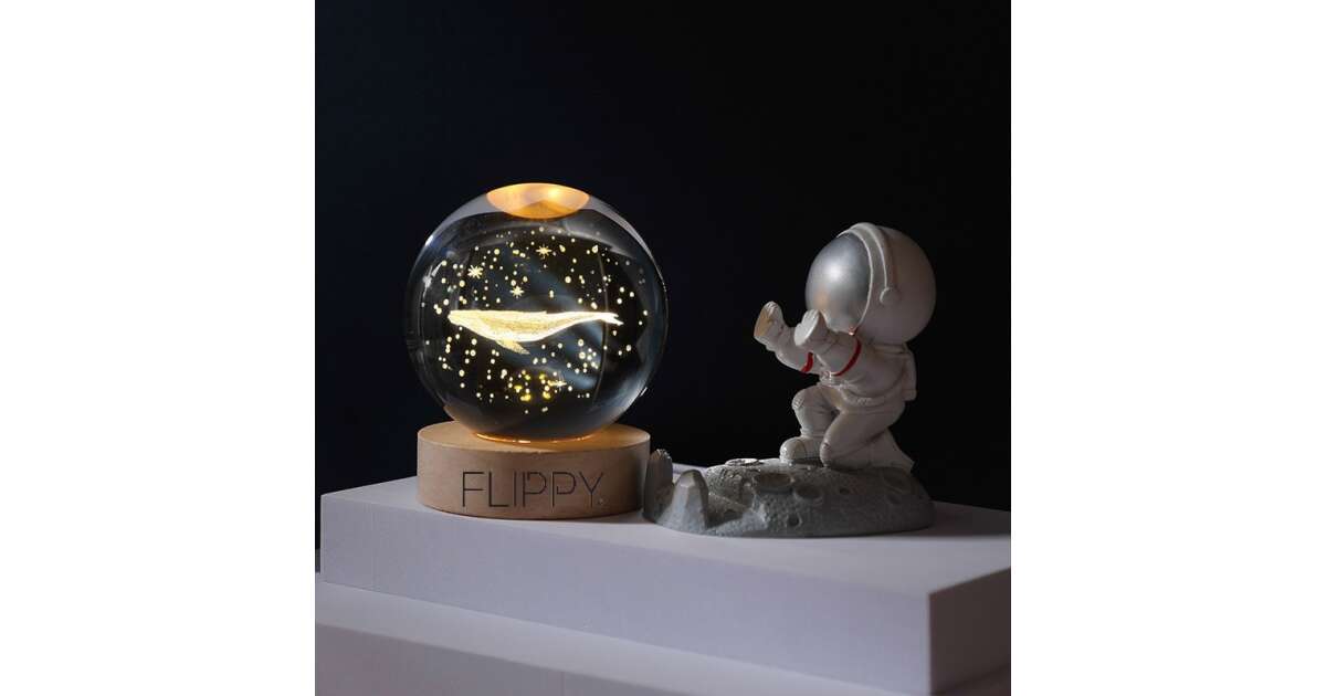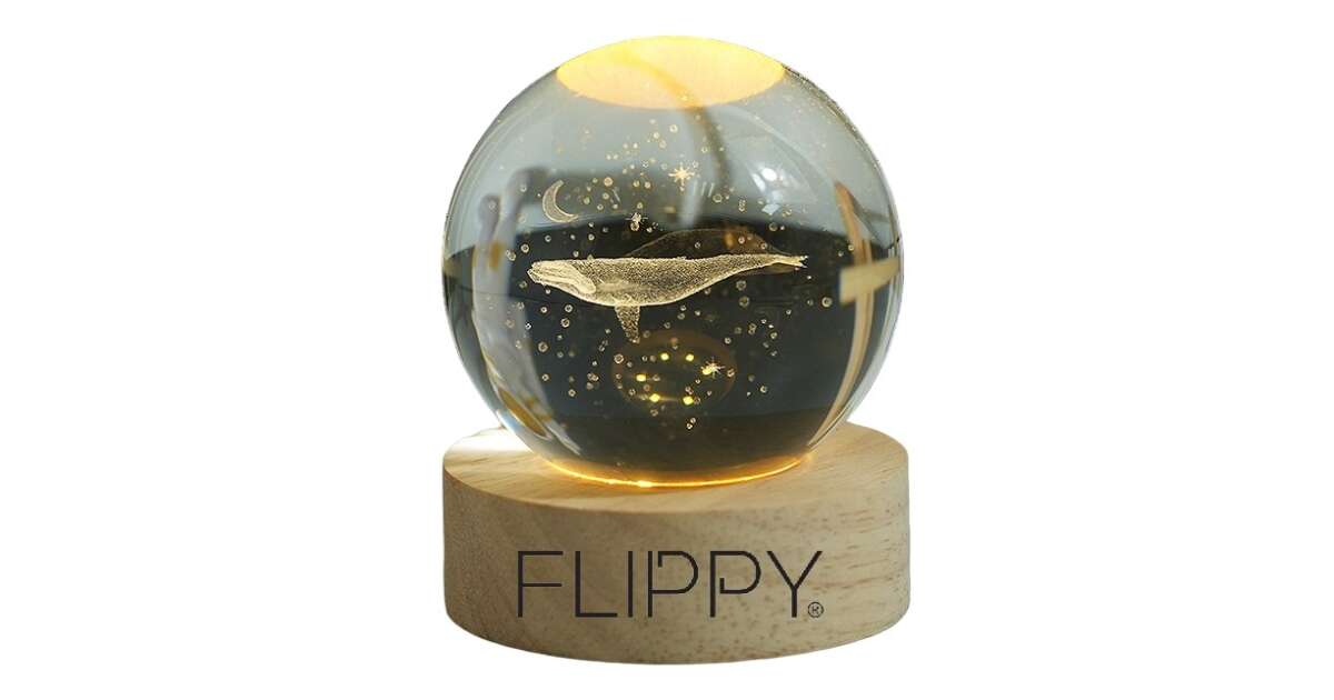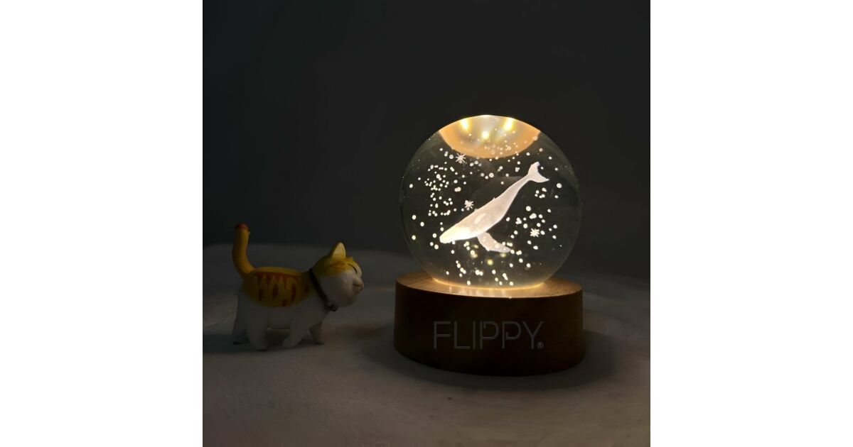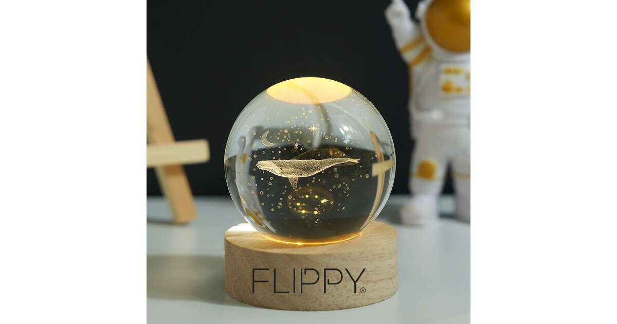 This Flippy LED lamp is a delightful decorative piece, perfect for creating a relaxing atmosphere in any room. The 6cm crystal globe, featuring a laser-engraved 3D whale swimming amongst stars, creates a magical visual effect.