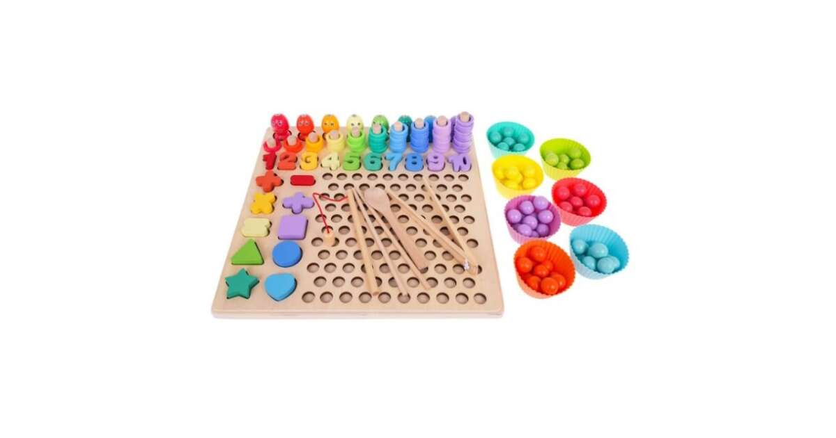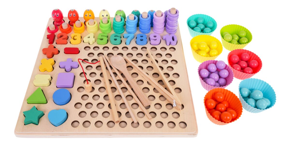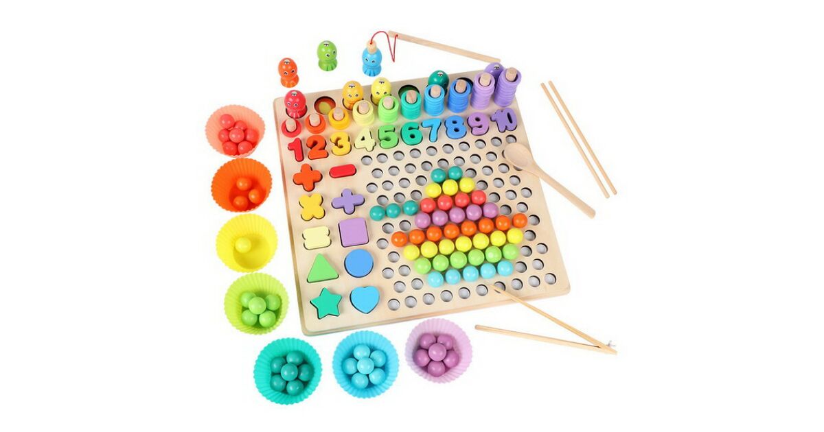 Creative Playworld 6-in-1 Wooden Toy Set: Fishing, Marble Sorting, Counting, Shape Sorter with Tweezers description of