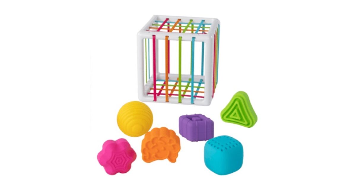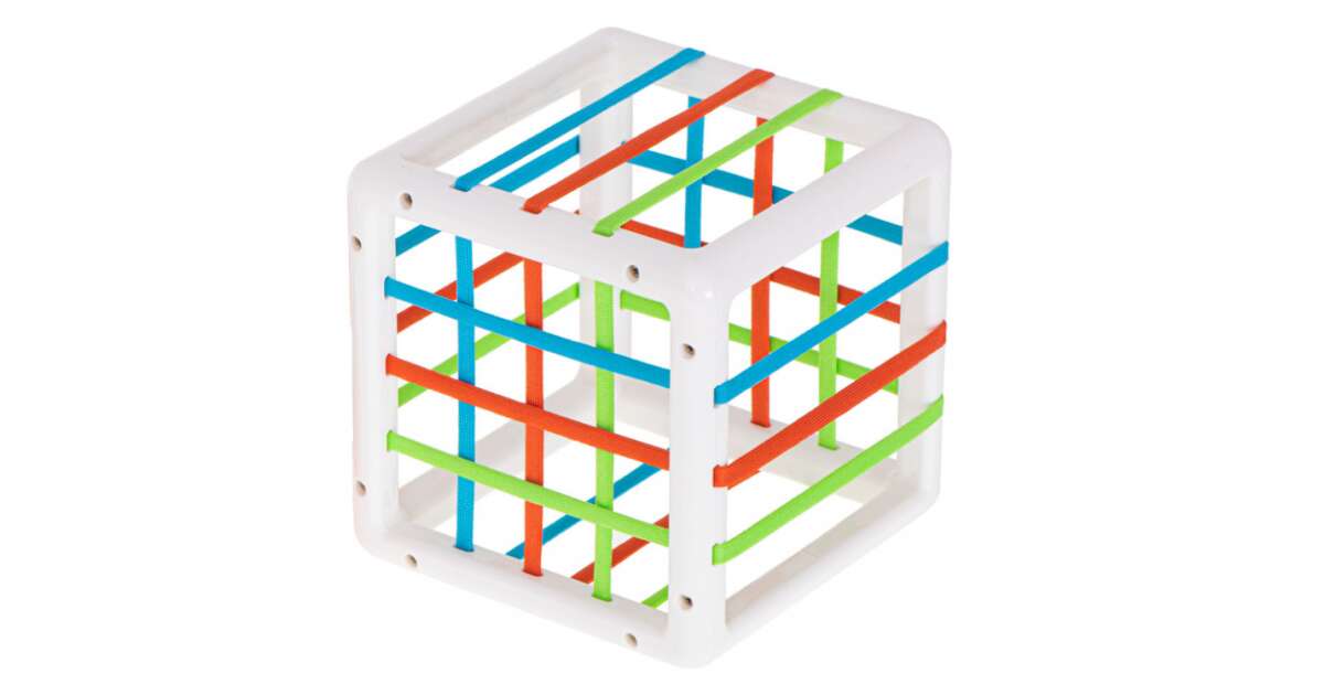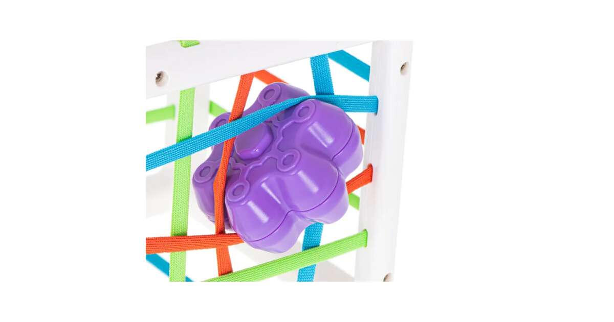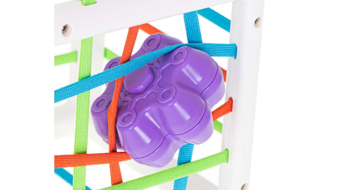 The game involves placing the colorful blocks through the rubber bands into the cube and taking them out. This is a fun and challenging task for little ones.