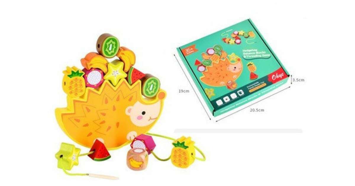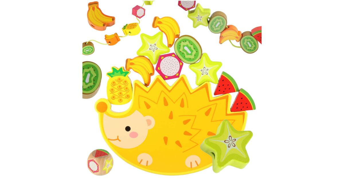 This fun hedgehog game offers hours of entertainment and valuable skill development for children ages 3 and up! Building a tower of colorful fruits develops dexterity, spatial reasoning, and logical thinking. Stringing the fruits together improves fine motor skills and hand-eye coordination.