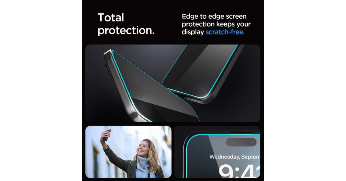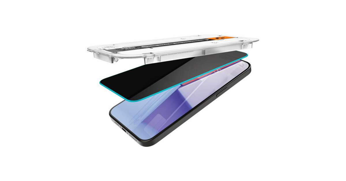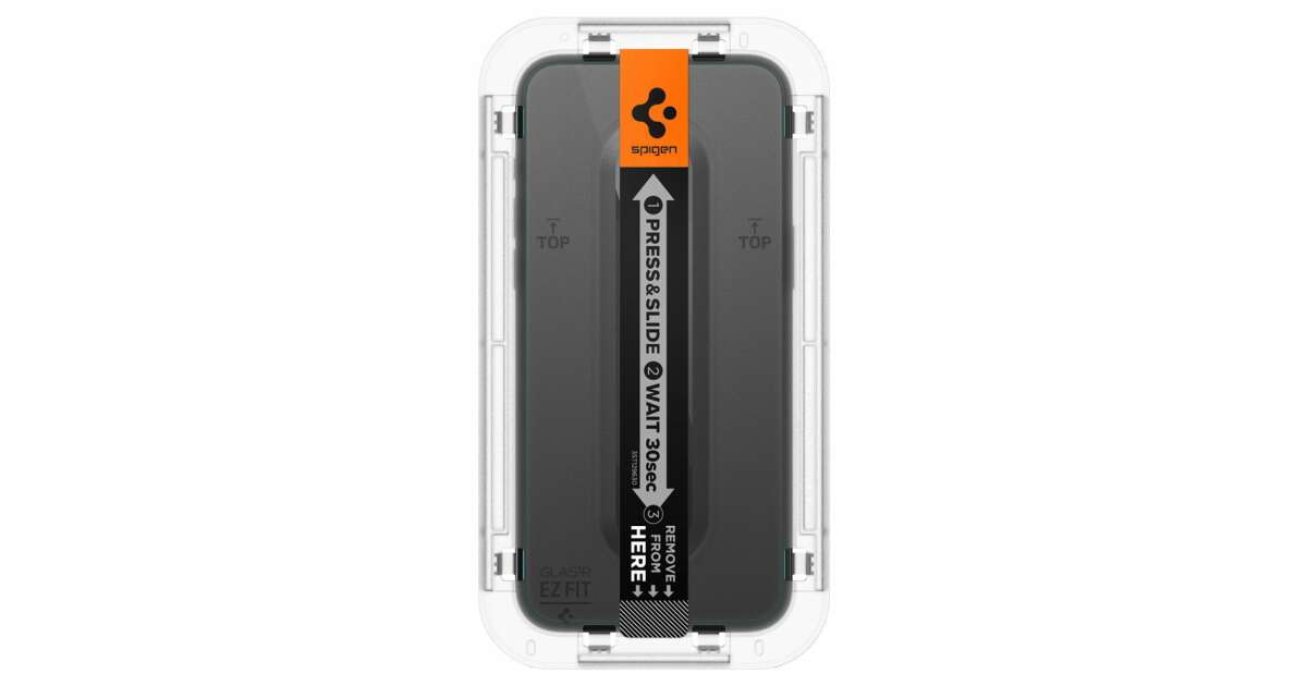 This Spigen EZ FIT GLAS.tR tempered glass screen protector offers perfect protection for your precious iPhone 15 Pro Max screen. The 9H hardness glass provides excellent protection against scratches and impacts. The package includes two screen protectors, so you always have a spare.