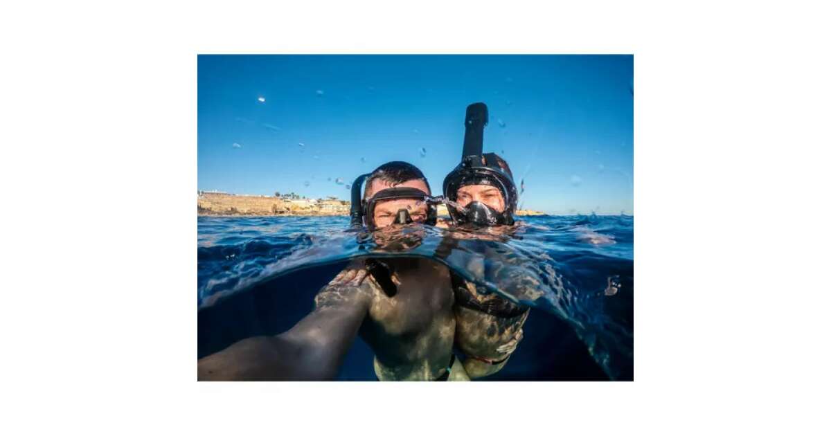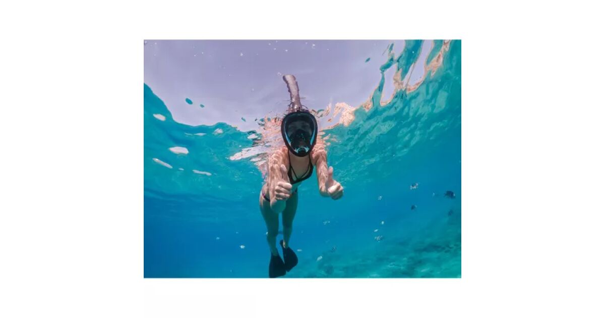 This full face snorkel mask revolutionizes your underwater experience! It provides exceptional comfort and a 180-degree panoramic field of vision, so you can see every detail underwater. The DryTop system prevents water from entering the snorkel, while the AntiFog technology protects against fogging.