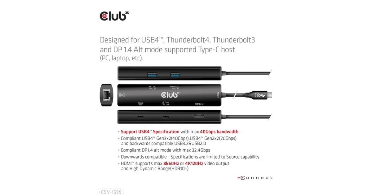 This Club 3D CSV-1599 USB4 dock gives your laptop or tablet tons of extra connections with just one cable. Simply plug it into your Type-C port and enjoy easy data transfer, high-resolution video, and super-fast internet.