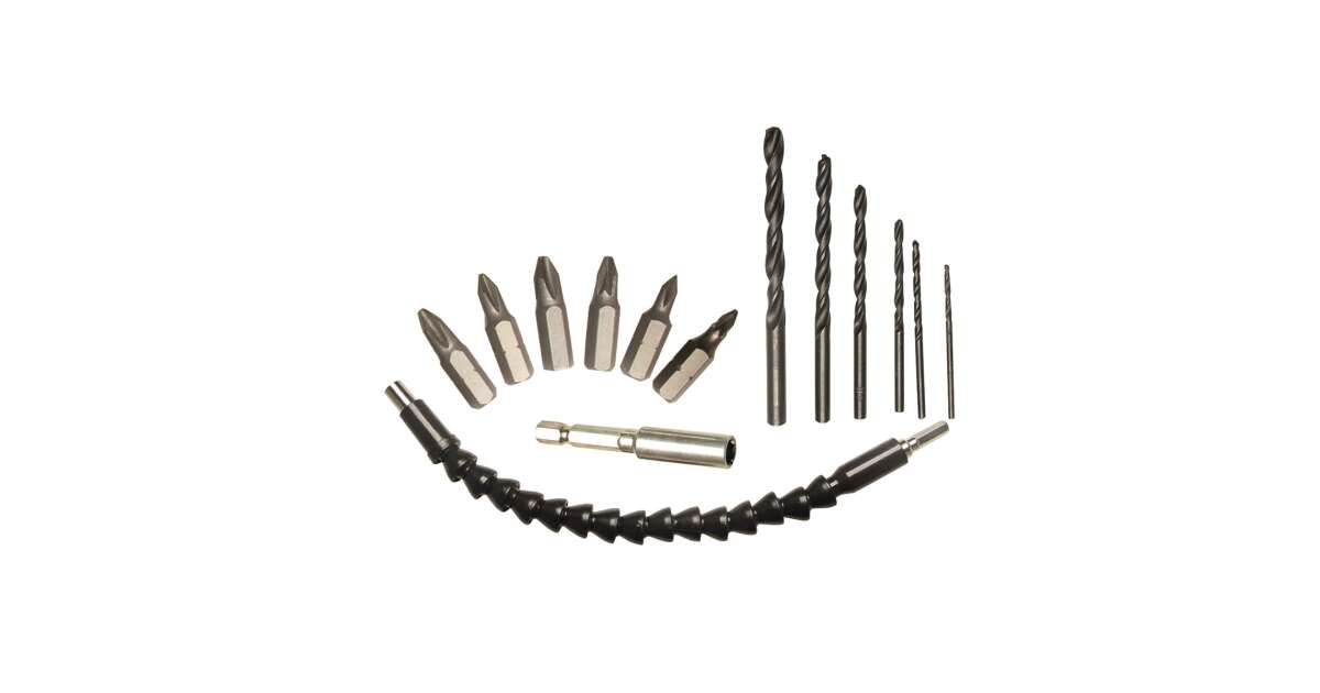 - 🧰 Rich Accessory Pack: 6 screwdriver bits, 6 drill bits, bit holder, flexible bit holder, and plastic case.