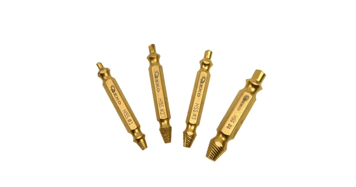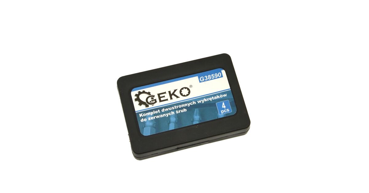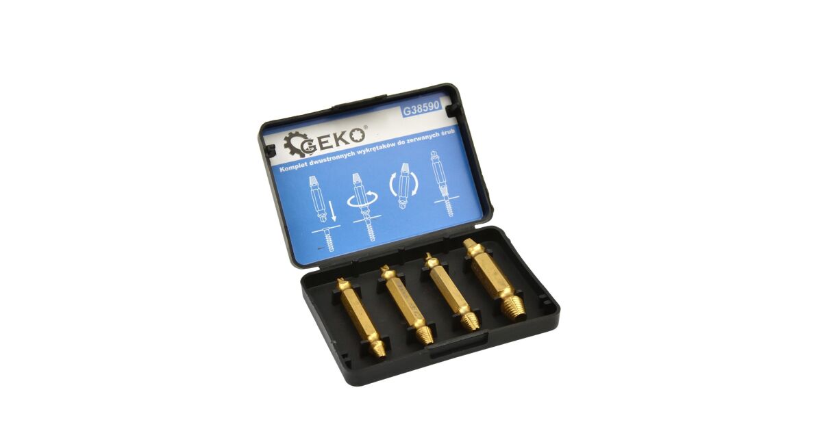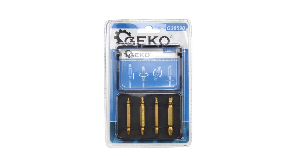Geko G38590 4-piece screw extractor set with double-ended bits for broken screws description of