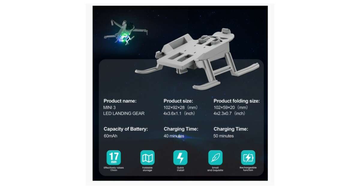 This STARTRC landing gear is the perfect accessory for your DJI Mini 3 drone if you want to land safely on uneven terrain. Its lightweight, durable design protects your drone from damage. The built-in LED lights allow for night flights with 4 colors and 3 lighting modes. ✨