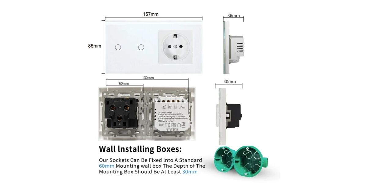 This combination of a double touch switch and socket offers a modern and stylish solution for controlling lighting and connecting electrical devices. The tempered glass frame provides an elegant look, while the built-in safety features guarantee your family's safety.