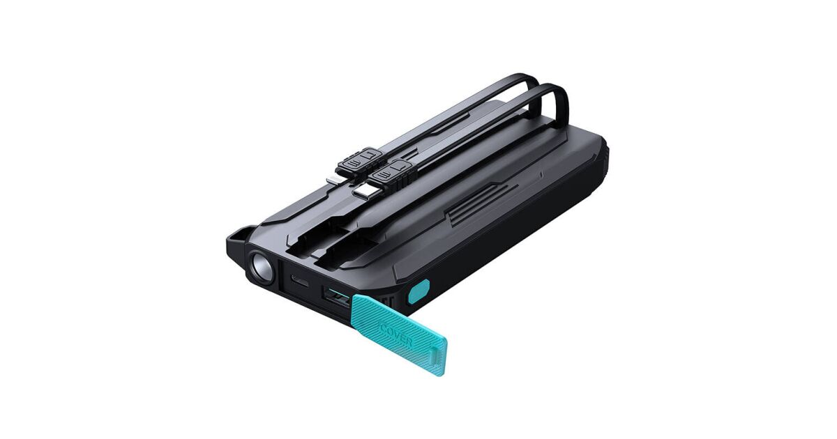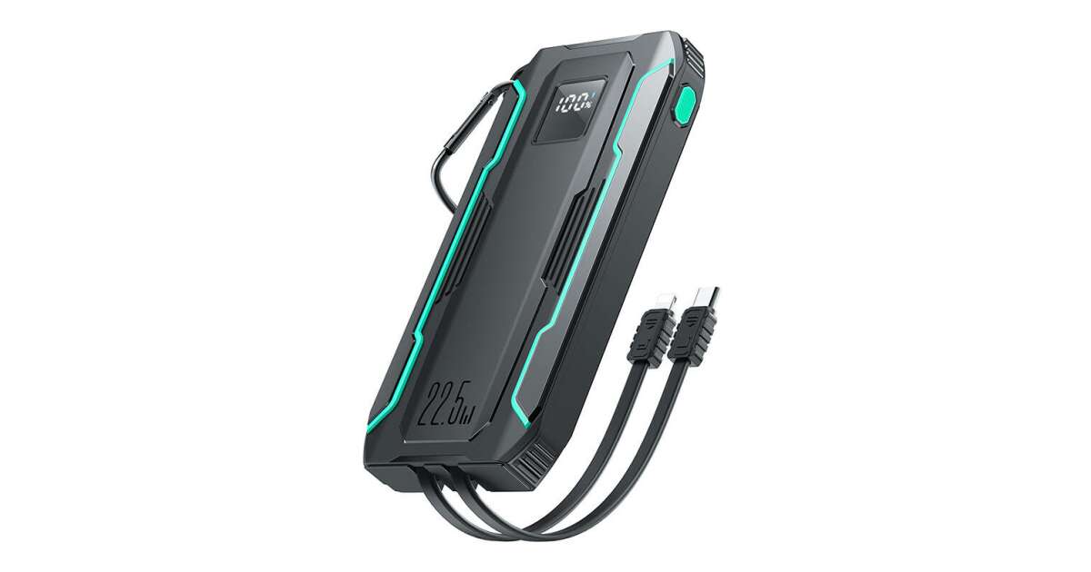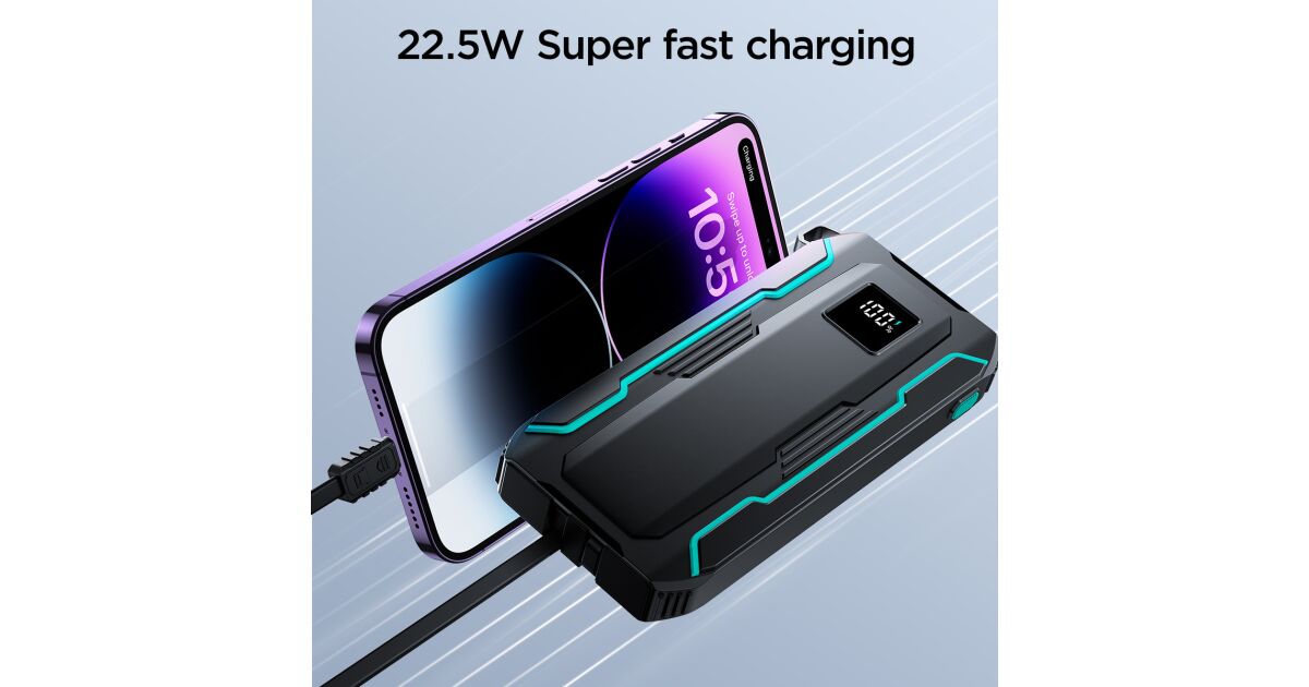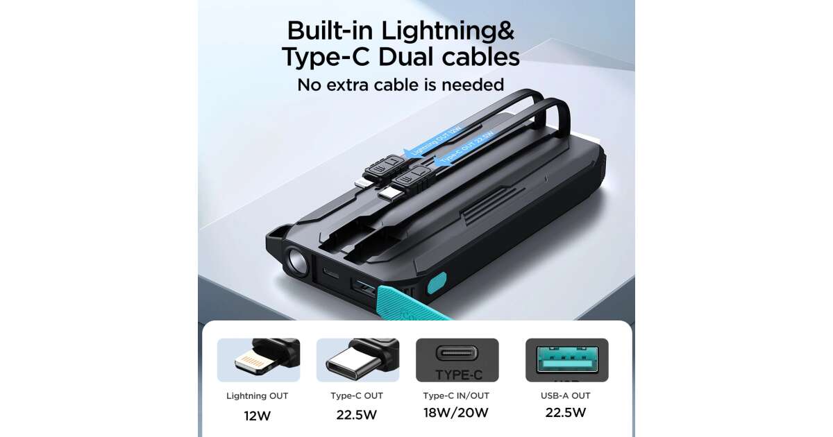 • Built-in Cables: No more cable clutter! The power bank comes with both USB-C and Lightning cables.