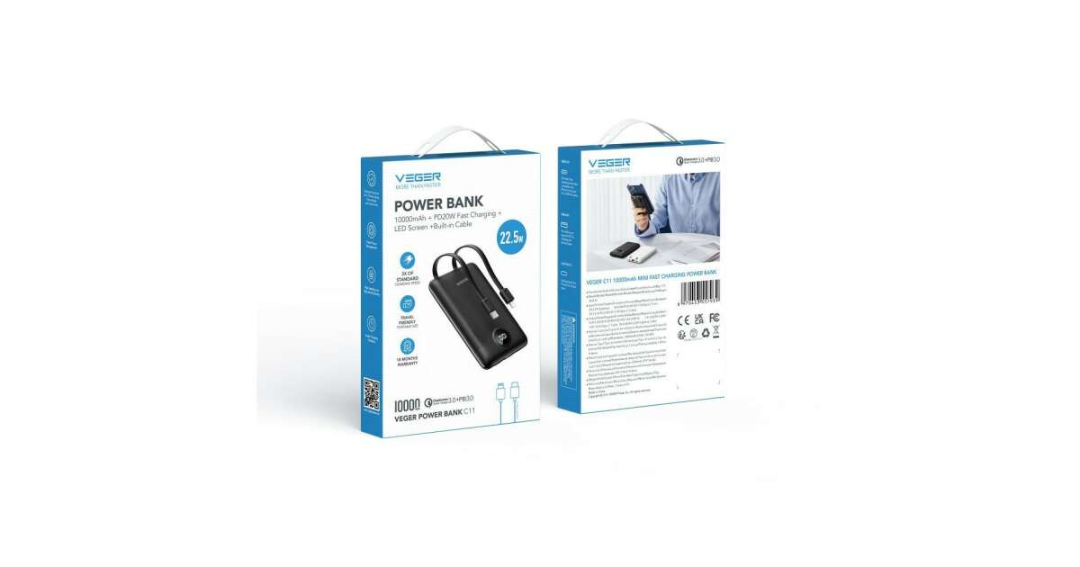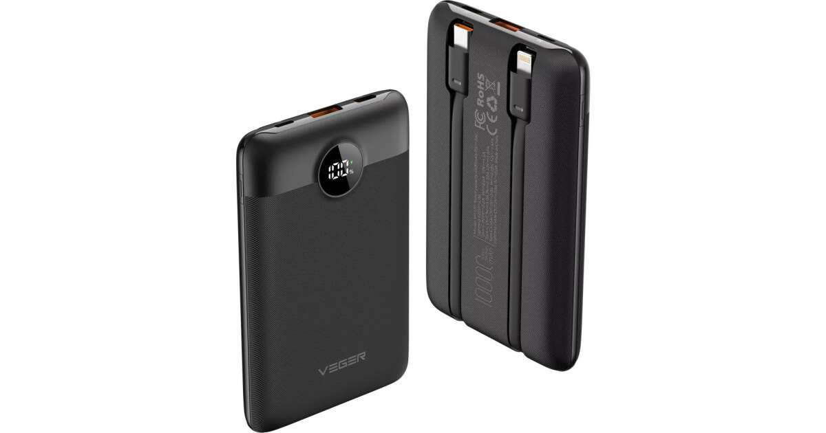 VEGER C11 power bank 10000mAh with Type-C and Lightning cables 22.5W - black shopping: