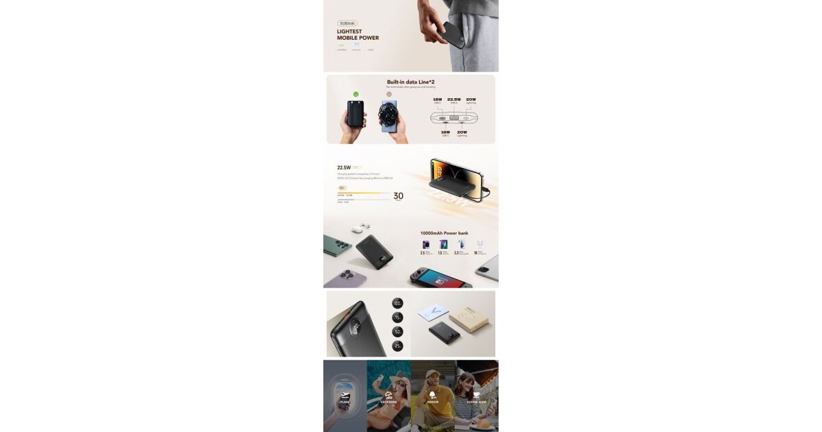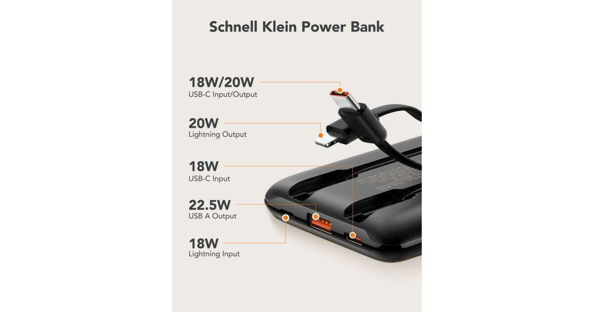 | Built-in Cables | USB-C (18W/20W input/output), Lightning (20W output) |