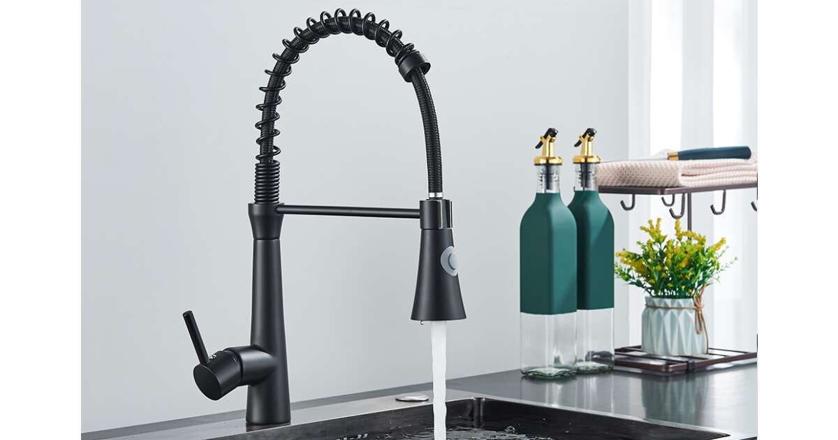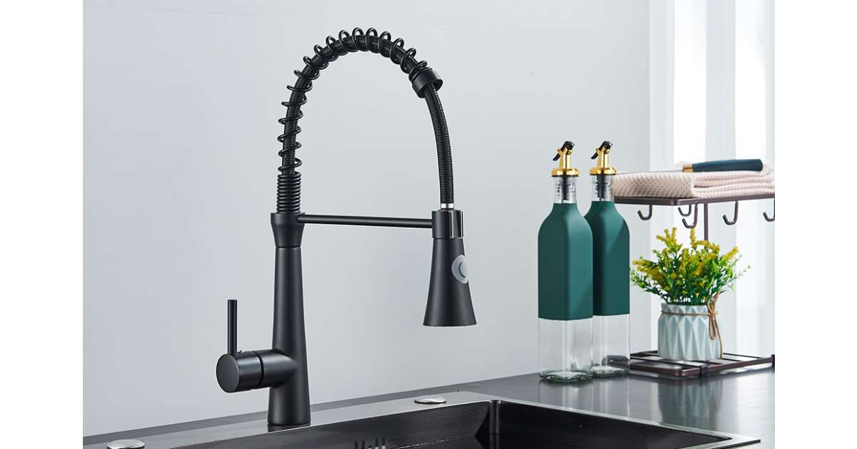 This stylish, black kitchen faucet is the perfect choice for a modern kitchen. The flexible spout lets you easily reach every corner of your sink, and the two modes offer extra convenience.