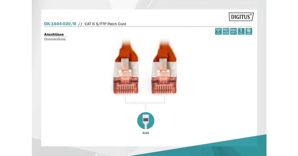 RJ45 Network Patch Cable CAT 6 S/FTP 2.00 m Red Halogen-free, stranded pair, Shielded, Flame-retardant Digitus (DK-1644-020/R) description of
